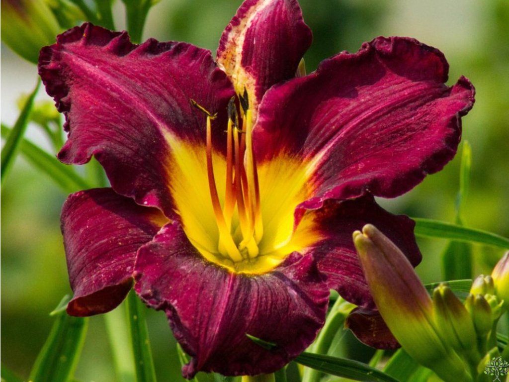 Taglilie 'Bela Lugosi' - wunderschöne Staude, die bis zu 60 cm hoch wird. Die Blüten sind in Form von großen, weit geöffneten Glocken und bestechen mit ihrer dunkelweinroten Farbe und der gelben Mitte auf den ersten Blick. Ihre bunten Blüten ähneln Lilien. Sie blüht von Juni bis August. Sie hat grüne, schmale, lange Blätter, die in Büscheln wachsen und in wärmeren Regionen immergrün sind. Ideal für jedes Blumenbeet.