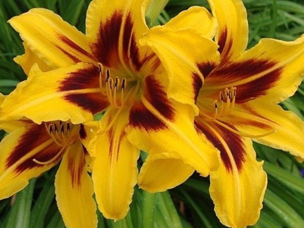 Taglilie 'Bonanza' - erreicht eine Höhe von 70 cm. Sie überwintert in ihren kräftigen, fleischigen Wurzeln. Sie blüht von Juli bis August. Dunkelgelbe Blüten mit rotbraunem Zentrum sind 6-8 cm groß. Die kräftigen Blüten haben einen gelben Hals. Sie hat grüne, schmal geformte, lange Blätter, die in Büscheln wachsen und in wärmeren Regionen immergrün sind. In unseren Breiten stirbt im Winter der oberirdische Teil ab.