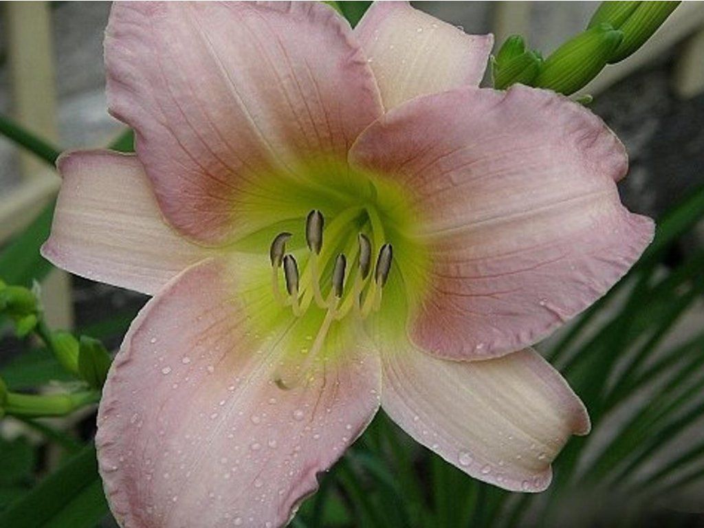 Taglilie 'Catherine Woodbury' - wächst bis zu 100 cm hoch. Sie überwintert in ihren kräftigen, fleischigen Wurzeln. Sie blüht von Juli bis August. Hellrosa Blüten mit grünem Zentrum sind 6-8 cm groß. Feste Blüten haben einen gelb-grünen Rachen. Sie hat grüne, schmal geformte, lange Blätter, die in Büscheln wachsen und in wärmeren Regionen immergrün sind. In unseren Breiten stirbt im Winter der oberirdische Teil ab.