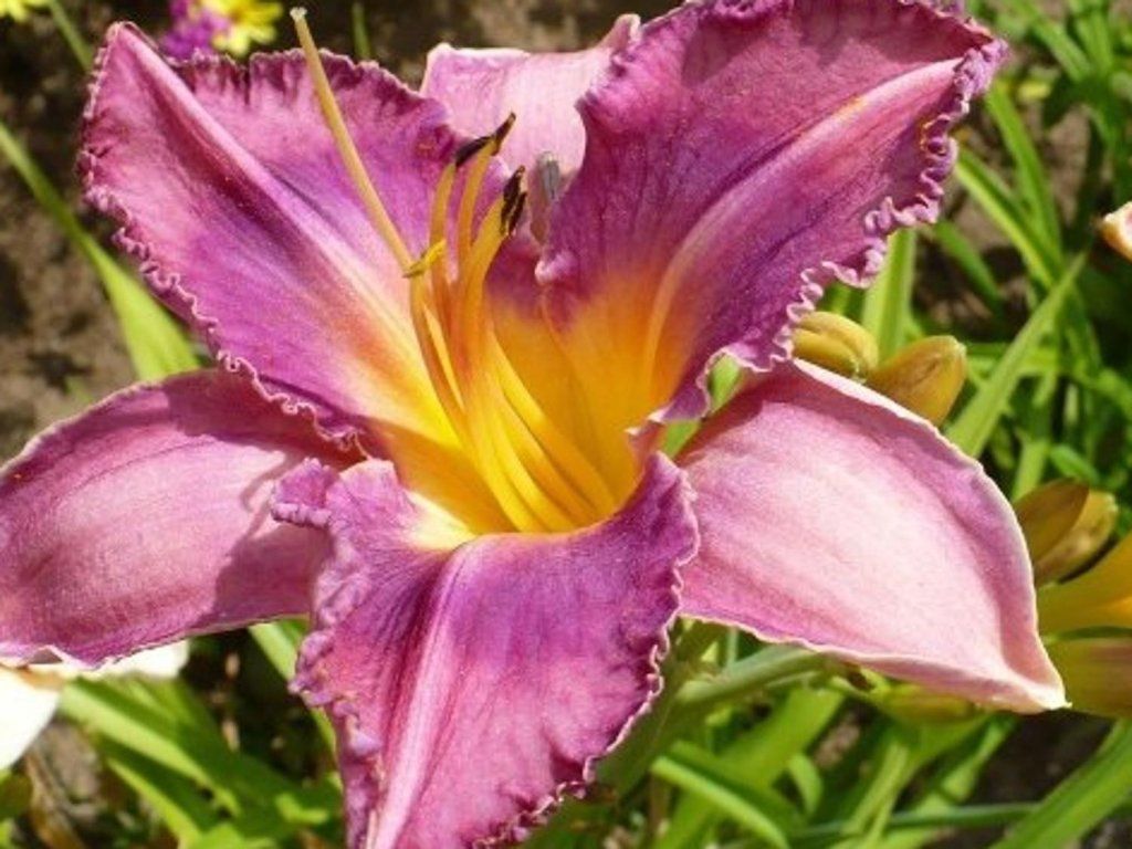 Taglilie 'Chicago Knobby' - wächst bis zu einer Höhe von 60 cm und einer Breite von 50 cm. Sie überwintert in ihren kräftigen, fleischigen Wurzeln. Blüht ab Juni. Pastellviolette Blüten sind 6-8 cm groß mit leicht gewellten Rändern. Feste, lilienartige Blüten haben eine tiefgelbe Kehle. Sie hat grüne, schmal geformte, lange Blätter, die in Büscheln wachsen und in wärmeren Regionen immergrün sind. In unseren Breiten stirbt im Winter der oberirdische Teil ab.