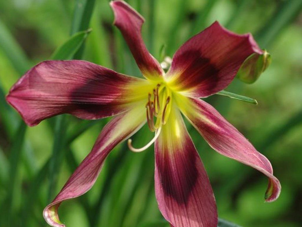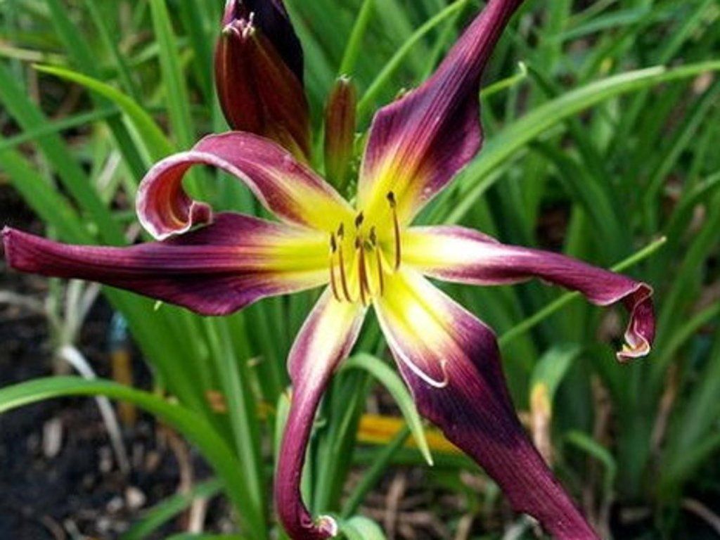 Taglilie 'Chokecherry Mountain' - eine einzigartige und attraktive Sorte der ansonsten gewöhnlichen Taglilie, die durch ihre ausgeprägte dekorative Qualität besticht. Sie unterscheidet sich von anderen vor allem durch ihre Blüten, die sowohl in Form als auch in Farbe spezifisch sind. Die Blütenblätter sind schmal, weit geöffnet und an den Enden leicht gebogen, was der Blüte ein plastisches und elegantes Aussehen verleiht. Die Blütenfarbe ist ein ausgeprägtes weinrot-violett mit einer kontrastierenden cremefarbenen und gelb gefärbten Kehle, wodurch die Blütenkomposition sehr lebendig und attraktiv wirkt. Die Blüten erscheinen vom Frühsommer bis zum Spätsommer, also von Juni bis August, und bilden eine langanhaltende und eindrucksvolle Farbdominante im Garten. Stark strukturierte Blätter wachsen in dichten Büscheln, sind schmal, lang und mittelgrün. In wärmeren Regionen behalten sie ihre immergrüne Eigenschaft, was den Zierwert der Pflanze das ganze Jahr über erhöht. Sie kommt als eigenständiges Solitärelement im Beet oder im Kübel zur Geltung, ist aber auch für kombinierte Pflanzungen mit weniger auffälligen Pflanzen geeignet, wo sie einen eindrucksvollen Kontrast schaffen und die Komposition mit ihren auffälligen Blüten und Blattstrukturen beleben kann. Sie kombiniert langes Blühen, dekoratives Laub und Widerstandsfähigkeit und bringt gleichzeitig Eleganz und einen raffinierten Farbakzent in den Garten.