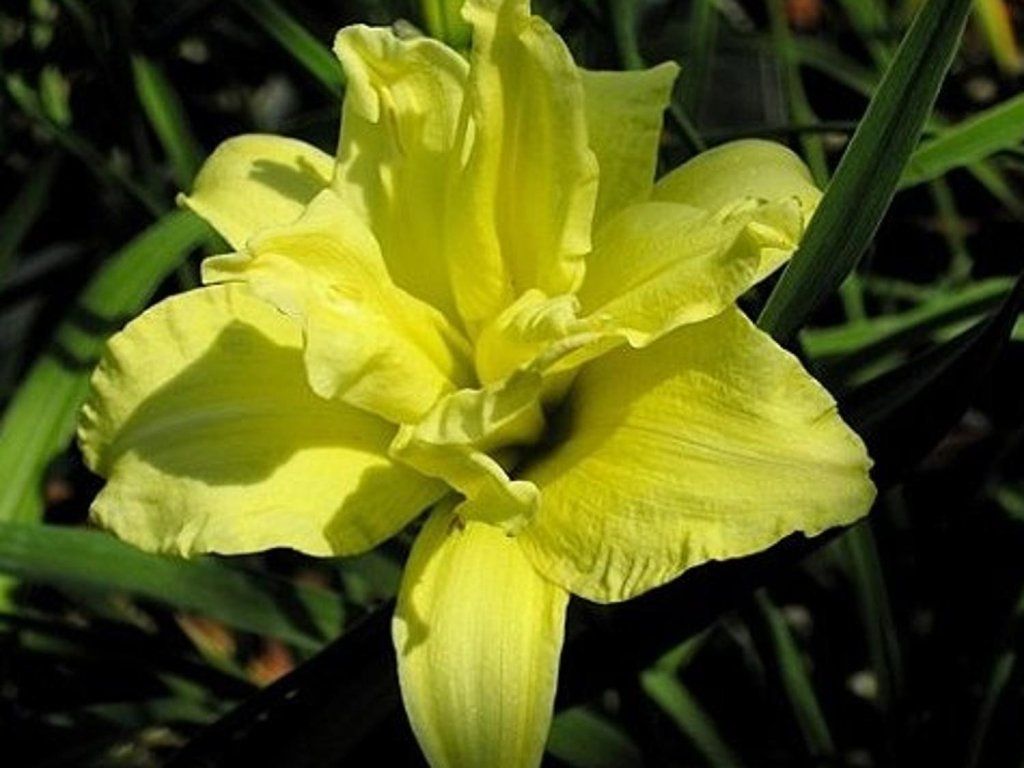 Taglilie 'Double River Wye' - erreicht eine Höhe von 75cm. Sie überwintert in ihren kräftigen, fleischigen Wurzeln. Sie blüht von Juli bis August. Schöne gelbe Blüten sind 6-8cm groß. Feste, lilienförmige Blüten haben eine gelbe Kehle. Sie hat grüne, schmal geformte, lange Blätter, die in Büscheln wachsen und in wärmeren Regionen immergrün sind. In unseren Breiten stirbt im Winter der oberirdische Teil ab.