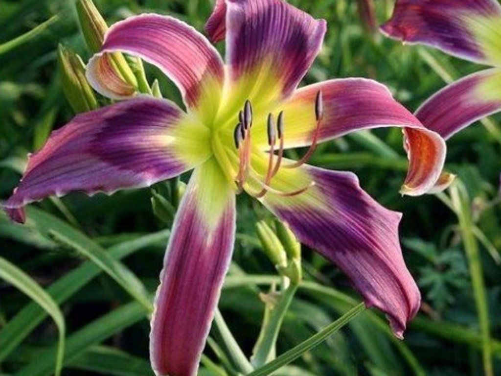 Taglilie 'Exotic Spider' - exotisch aussehende Sorte. Sie unterscheidet sich von anderen Taglilien durch die Form der Blüte, deren Blütenblätter „spinnenartig“ ausgebreitet sind. Sie haben eine bunt violette Farbe. Die Mitte ist gelb. Die Pflanze erreicht eine Höhe von 55 cm. Sie wird sowohl als Solitärpflanze als auch als Teil von Staudenbeeten großartig aussehen.