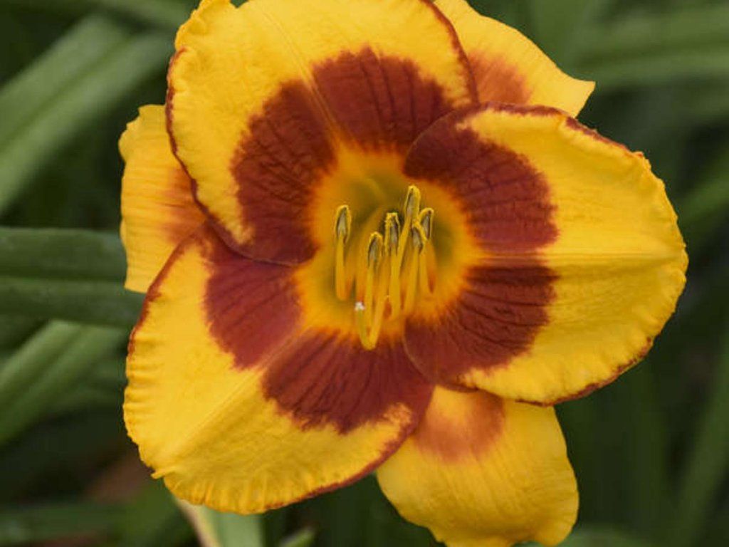 Taglilie 'Fooled Me' - eine sehr interessante Taglilien-Sorte, die bis zu 60 cm hoch wird. Ihre Beliebtheit verdankt sie ihren sehr interessanten Blüten, obwohl die einzelnen Blüten nur einen Tag halten. Sie bildet einen dichten Horst aus grasartigen, dunkelgrünen Blättern mit aufrechten Stielen, an denen sich im Juli und August attraktive Blüten zeigen. Diese sind tiefgelb mit einem ausgeprägten ziegelroten Fleck in der Mitte und einer Umrandung an den Blütenblattkanten. Die Ränder der Blütenblätter sind leicht gewellt. Sie blüht im Sommer reichlich, wobei die Blütezeit mehrere Wochen dauern kann. Die ideale Wahl für alle, die eine Pflanze suchen, die lange blüht und gleichzeitig pflegeleicht ist, sei es im Garten, auf der Terrasse oder in Blumenbeeten.