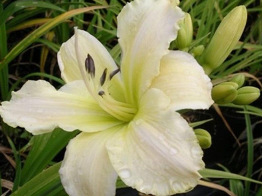 Taglilie 'Ice Carnival' - sehr schöne Staude, die horstartige Hügel voller schmaler, flacher, grüner Blätter bildet. Ohne Blüte erreicht sie eine Höhe von 60 cm. Die Blüten erheben sich auf starken Stielen und haben eine schneeweiße bis fast weiße Farbe. Sie blühen nacheinander im Laufe des Sommers, wobei jeder neue Tag eine neue Blüte bedeutet. In unseren Breiten stirbt im Winter der oberirdische Teil ab.
