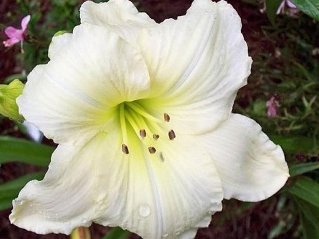 Taglilie 'Joan Senior' - die Sorte 'Joan Senior' wurde 1977 vom amerikanischen Züchter John B. Durio eingeführt und gehört zu den bewährten hellen Sorten, die bei nordamerikanischen Taglilien-Prüfungen ausgezeichnet wurden. Die Pflanze bildet einen Horst aus schmalen, bogenförmig überhängenden Blättern, der im Erwachsenenalter meist 45–60 cm breit ist und im Herbst meist einzieht und in fleischigen Wurzeln und kurzen Rhizomen überwintert. Im Sommer wachsen daraus verzweigte Blütenstiele von etwa 70–80 cm Höhe, und im Juli bis August öffnen sich darauf nach und nach große Blüten von 12–15 cm. Die Färbung ist cremeweiß bis fast weiß mit einem helleren gelben Stich und einem limettengrünen Schlund, die Ränder sind meist leicht gewellt und die Textur der Blütenblätter wirkt glatt. Die Blüten duften oft leicht und locken bestäubende Insekten an. Eine einzelne Blüte hält einen Tag, aber weitere Knospen folgen, sodass die Blüte mehrere Wochen lang kontinuierlich wirkt. In Kompositionen fungiert sie als heller Punkt neben blauvioletten Stauden und Gräsern, passt gut zu Katzenminze, Lavendel, Storchschnabel oder Perowskia und kommt auch in Wiederholungen entlang von Wegen zur Geltung. Die Blüten eignen sich für kleinere Schnittblumenarrangements.