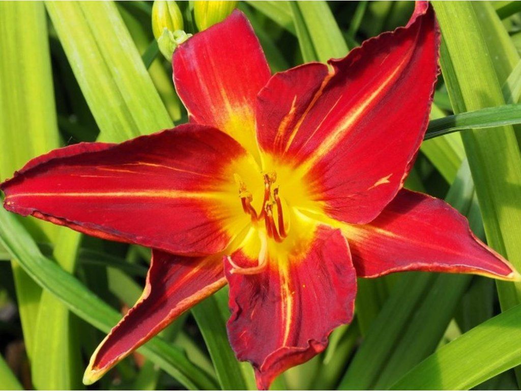 Taglililien 'Jolly Hearts' - eine sehr attraktive, horstbildende Staude, die vor allem wegen ihrer großen und auffälligen Blüten beliebt ist, die auch dann ins Auge fallen, wenn die einzelnen Blüten nur einen Tag halten. Im ausgewachsenen Zustand erreicht sie eine Höhe von 45–60 cm und bildet dichte Horste aus grasartigen, dunkelgrünen Blättern, aus denen aufrechte Stiele mit Blüten wachsen. Die Blüten erscheinen vom Anfang bis zum Ende des Sommers, also im Juli und August, und sind leuchtend rot mit einem kontrastierenden gelben Zentrum, wobei die Ränder der Blütenblätter leicht gewellt sind, was der Komposition Leichtigkeit und einen dekorativen Effekt verleiht. Sie blüht üppig und die Blüte einzelner Horste kann mehrere Wochen dauern, wodurch sie eine langanhaltende Farbdominante in Beeten oder auf Terrassen gewährleistet. Sie eignet sich für Staudenbeete, Solitärpflanzungen, Gruppenkompositionen und die Kultur in Gefäßen, wo sie durch ihre Blütenfarbe und -form besticht. Sie ist pflegeleicht und wirkt dank ihres dichten Blattwerks auch außerhalb der Blütezeit elegant, was sie zur idealen Wahl für die Gartengestaltung, dekorative Kompositionen sowie für Anfänger und erfahrene Gärtner macht, die eine Kombination aus Schönheit, langer Blütezeit und einfacher Pflege suchen.
