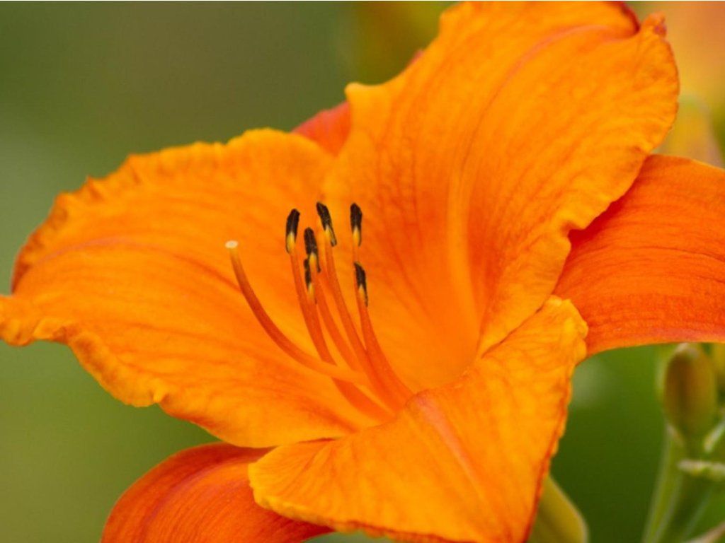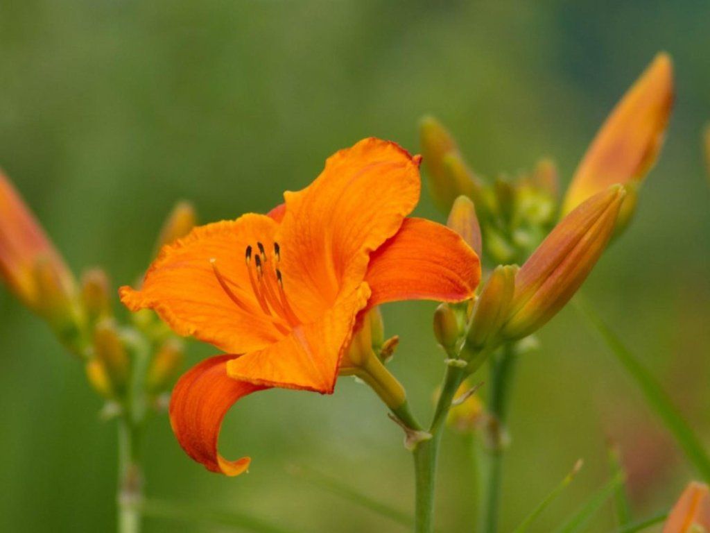 Taglilie 'Mauna Loa' - erreicht eine Höhe von 50-60 cm. Sie überwintert in ihren kräftigen, fleischigen Wurzeln. Sie blüht von Juli bis August. Wunderschöne, tief orangefarbene Blüten sind 6-8 cm groß. Feste, lilienartige Blüten haben einen tief gelb-orangen Schlund. Sie hat grüne, schmal geformte, lange Blätter, die in Büscheln wachsen und in wärmeren Regionen immergrün sind. In unseren Breiten stirbt im Winter der oberirdische Teil ab.