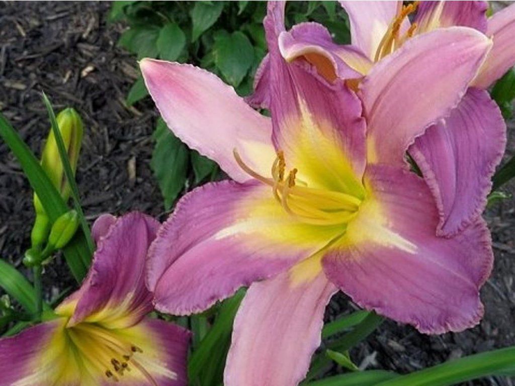 Taglilie 'Nile Crane' - erreicht eine Höhe von 90 cm. Sie überwintert in ihren kräftigen, fleischigen Wurzeln. Sie blüht von Juli bis August. Fliederfarbene Blüten mit gelbem Zentrum sind 6-8 cm groß. Feste, lilienartige Blüten haben eine tief gelb-grüne Kehle. Sie hat grüne, schmal geformte, lange Blätter, die in Büscheln wachsen und in wärmeren Regionen immergrün sind. In unseren Breiten stirbt im Winter der oberirdische Teil ab.