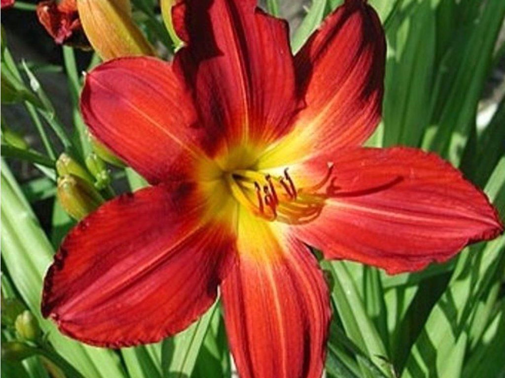 Taglilie 'Pillar of Fire' - erreicht eine Höhe von etwa 60-90 cm. Sie überwintert in ihren kräftigen, fleischigen Wurzeln. Sie blüht von Juli bis August. Rote Blüten mit gelbem Auge sind 6-8 cm groß. Feste, lilienartige Blüten haben eine tief gelb-grüne Kehle. Sie hat grüne, schmal geformte, lange Blätter, die in Büscheln wachsen und in wärmeren Regionen immergrün sind. In unseren Breiten stirbt im Winter der oberirdische Teil ab.