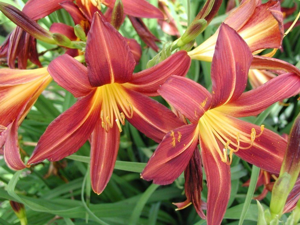 Taglilie 'Red Braun' - kompakte, langlebige Gartenschönheit. 'Göttin der Schönheit' eines sonnigen Tages, jede Blüte blüht nur einen Tag. Dunkelgrüne Blätter wachsen in Büscheln, sind schmal und rinnig. Sie erreicht eine Höhe von etwa 60 cm. Auf kräftigen Stielen erheben sich große, farblich auffällige, rotbraune Blüten mit gelber Mitte. Die Pflanze blüht vom Juli bis zum Ende der Saison. Sie eignet sich für Gruppenpflanzungen. Höhere Kultivare verwenden wir als Solitärpflanzen, kleinere dann für die Kultivierung in Gefäßen. Wir können sie mit Sonnenhut, Schafgarbe, Argentinischem Eisenkraut, sibirischen Schwertlilien, Fingerhut, Königskerze, Glockenblumen und Monarden kombinieren. Sie finden ihren Platz als Ergänzung zu Wasserelementen. Sie sehen unwiderstehlich aus mit hohen Gräsern.