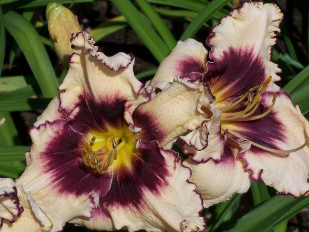 Taglilie 'Sabine Baur' - interessant gefärbte, niedrigere Taglilien-Sorte. Wächst in kompakten Büscheln, die eine Höhe von 30-60 cm erreichen. Bildet feste, aufrechte Stiele mit Knospen, die sich von Juli bis August zu cremeweißen Blüten mit einem riesigen purpurnen Auge und gekräuselten Rändern öffnen. Stark strukturierte Blätter wachsen in dichten Büscheln und sind schmal, lang und mittelgrün. In wärmeren Regionen sind sie immergrün. Kommt in jedem Beet zur Geltung, am besten jedoch in der Kombination mit Ziergräsern oder Gehölzen.