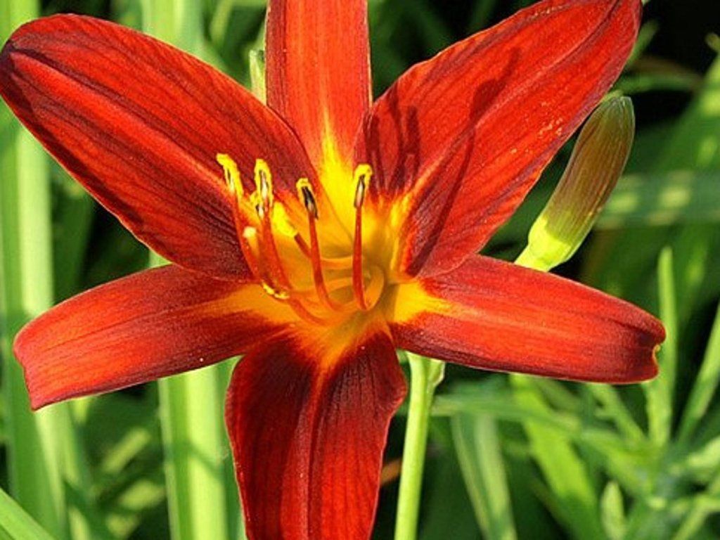 Taglililie 'Sammy Russel' - anspruchslose, horstige Staude, die bis zu 100 cm hoch wird. Die Blütenfarbe ist ziegelrot mit einem gelb-orangen Schlund. Eine vitale Sorte, die von Juli bis August blüht. Sie hat grüne, schmale, lange Blätter, die in Büscheln wachsen und in wärmeren Regionen immergrün sind. Ideal für jedes Blumenbeet.