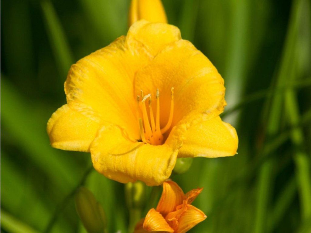 Taglilie 'Stella de Oro' - zweifellos die beliebteste Sorte 'Goldstern'. Die Sorte Hemerocallis 'Stella de Oro' wurde vom amerikanischen Züchter Walter Jablonski gezüchtet und 1975 eingeführt. Es handelt sich um eine diploide, zurückziehende Staude, die im Herbst ihre Blätter verliert und im Frühjahr schnell einen kompakten Fächer aus schmalen, bogenförmig überhängenden Blättern wiederbildet. Das Wachstum ist mittelschnell und der Horst erreicht normalerweise innerhalb von 2–5 Jahren seine volle Größe. Die Blütenstiele werden meist 30–40 cm hoch, der ausgewachsene Horst vergrößert sich allmählich auf etwa 40–50 cm. Von Juni bis September öffnen sich über dem Laub allmählich trichterförmige Blüten von etwa 7 cm Größe, kanariengelb bis goldgelb mit einem orangen Schlund und zartem Duft. Der Blütenrand ist leicht gewellt und warmes Wetter fördert weitere Blühwellen. Eine einzelne Blüte hält in der Regel einen Tag, aber die Pflanze setzt Knospen in Serien an, sodass das Beet viele Wochen lang blühend wirkt. In Kompositionen eignet sie sich als Wegsaum, zur Bepflanzung von Vorgärten und als niedriger Akzent zwischen Gräsern, Katzenminze, Salbei und Lavendel, oder vor Rosen als heller Unterwuchs. Sowohl die Blüten als auch die Knospen von Taglilien sind essbar; für die Verwendung in der Küche eignen sich nur Pflanzen, die ohne chemische Spritzmittel und mit gesichertem Ursprung angebaut wurden.