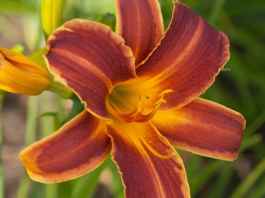 Taglilie EveryDaylily 'Red Rib'® - eine raffiniert gefärbte Sorte aus der Serie EveryDaylily™ mit weinroten, großen Blüten, die deutlich von gelben Streifen gesäumt sind. Diese gehen bis zu einem goldgelben Blütenrachen über. Im Gegensatz zu den meisten wiederholt blühenden Taglilien, die im Sommer vorübergehend aufhören zu blühen, sorgt sie für Blüten während der gesamten Saison. Sie erscheinen nämlich ununterbrochen über Monate hinweg, von Juni bis Ende September. Dies ist eine ausgezeichnete, wiederblühende Pflanze, die mit dem Alter bis zu 300 Blüten pro Jahr hervorbringen kann. Sie erreicht eine Höhe von etwa 35 cm und ihre Blüten haben eine Größe von bis zu 10 cm. Sie bildet üppige Horste aus schmalen, bogenförmig überhängenden Blättern. Die Serie EveryDaylily® gilt unter Experten als eine der besten unter den immerblühenden Taglilien weltweit. Dank ihres kompakten Wuchses und ihrer reichen Blüte eignet sie sich als Bodendecker, für die Vorderseite von Beeten oder für die Kultur in Gefäßen.
