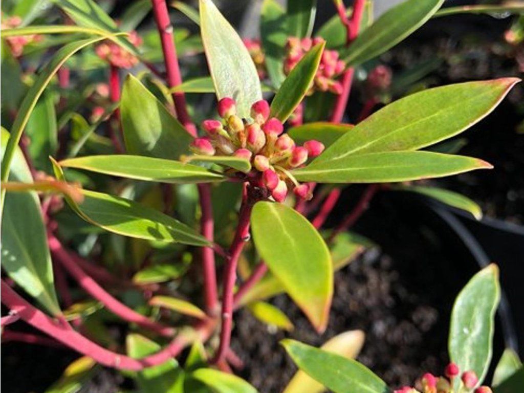 Tasmanischer Pfeffer 'Red Spice' - Syn. Tasmannia lanceolata 'Red Spice'. Bildet einen attraktiven, kompakt wachsenden, immergrünen kleinen Strauch. Er hat kontrastreiche, dunkelrote Stiele mit ledrigen, glänzend grünen Blättern. Blüht im Frühling; die Blüten sind cremefarben-gelb mit gelben Staubgefäßen. Die Früchte sind kleine, dunkle Beeren. Diese werden zusammen mit den Blättern getrocknet als Gewürz verwendet.