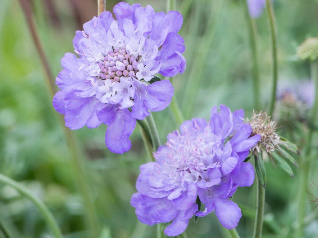 Skabiose 'Mariposa Blue' - eine kurzlebige Staude bis zweijährige Pflanze aus der Familie der Geißblattgewächse, ursprünglich aus wärmeren Teilen Europas, wo sie an trockenen, kalkhaltigen Hängen und in lichten Rasen wächst. Die Sorte 'Mariposa Blue' stammt von John Robb und ist als geschützte Sorte (PBR) eingetragen. Sie bildet eine bodennahe Rosette aus graugrünen, gelappten Blättern und darüber feste Stiele mit Blüten in Form von kissenartigen Körbchen. Das Blütenpolster hat ein blauviolettes Zentrum und breitere Randblüten mit einem feinen Spitzenrand. Während der Blüte erreicht sie etwa 35–45 cm und der Horst breitet sich normalerweise auf 30–40 cm aus. Die Blüten liefern Nektar und Pollen, weshalb sie von Bienen, Hummeln und Schmetterlingen aufgesucht werden. Nach der Blüte bilden sich dekorative Fruchtstände, die den Zierwert verlängern. Im Garten wirkt sie natürlich in Staudenbeeten, in Kiespflanzungen und an Wegrändern, wo sie gut mit Lavendel, Salbei, Sonnenhut, Schafgarbe und Ziergräsern harmoniert. Besonderheit sind zwei Blattarten: bodennahe sind breiter und gelappt, am Stängel dann schmal und tief geteilt, was dem Horst eine feine Textur verleiht. Die Blüten öffnen sich nacheinander, sodass die Blüte auch an einem Horst lange anhält. Nach der Blüte bleiben feste Fruchtstände erhalten, die oft für die späte Sommerstruktur belassen werden.