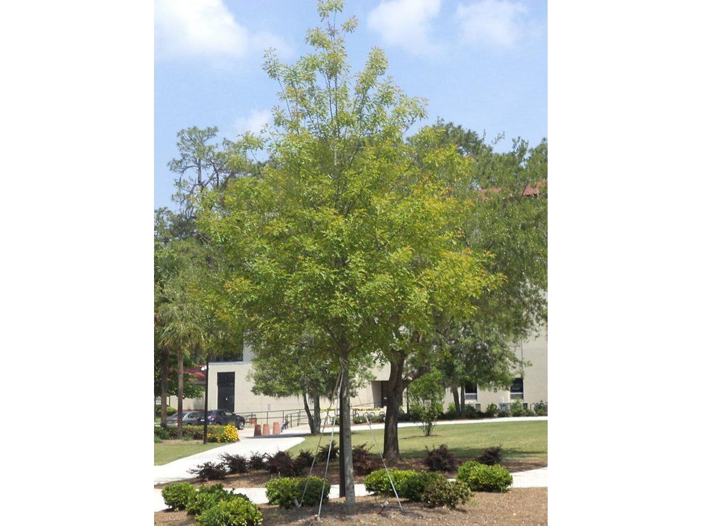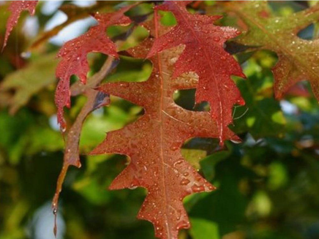 Texas-Eiche - ein relativ kräftiger, hoher Baum, der 20-25 m erreicht. Bildet einen Hauptstamm mit fast waagerecht wachsenden Seitenästen. Die Krone ist breit kegelförmig, im Laufe der Jahre eher kugelförmig, halb offen. Die Blätter sind oval bis elliptisch, tief eingeschnitten, die jungen Blätter sind bronzefarben, im Laufe der Saison dunkelgrün, im späten Herbst werden sie rot. Die Unterseite des Blattes ist leicht behaart. Die Früchte sind ovale Eicheln, etwas größer als die Sumpfeiche.
