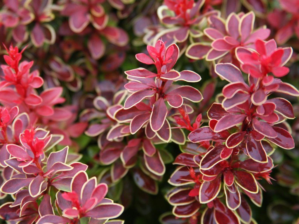 Berberitze Thunbergs 'Admiration' - eine Zwergvariante des Berberitzenstrauchs, der in der Reife eine Höhe von etwa 30 cm und eine ähnliche Breite erreicht, mit rot gefärbten ovalen Blättern mit einem Hauch von Orange und gelben Rändern. Anspruchslose Sorte, geeignet für sonnige Standorte. Insgesamt ist die Berberitze ein schönes Element für Gärten und bringt ein einzigartiges Aussehen in jeden Garten.