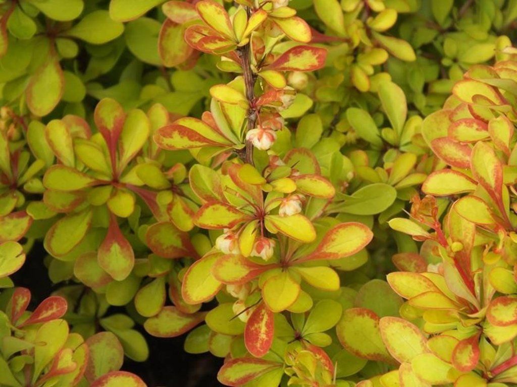Berberitze Thunbergs 'Diabolicum' - ein kompakter, buschiger und dorniger Strauch. Er erreicht eine Höhe von etwa 60 cm bei gleicher Breite. Gebogene Stiele tragen kleine, abgerundete Blätter, die gelbgrün bis grün gefärbt sind. Die Blätter sind rot gesäumt. Im Herbst ändert sich die Farbe zu orange-gelb. Er blüht mit kleinen gelben Blüten, meist im April und Mai. Ideal für Gruppenpflanzungen oder als Solitär.