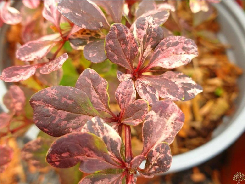 Berberitze Thunbergs 'Flamingo'- ein weiterer farbenfroher Leckerbissen unter den Berberitzen, der mit seiner Eleganz und zarten Färbung an das Gefieder exotischer Vögel erinnert. Er ist ein sehr attraktiver, laubabwerfender Strauch, der aufrecht und mäßig kräftig wächst und im Erwachsenenalter eine Höhe von etwa 1 bis 1,5 Metern erreicht. Die Blätter sind bei diesem Kultivar absolut entscheidend. Die Grundfarbe ist ein tiefes Weinrot bis Purpur, aber was ihn besonders macht, ist die reiche rosa und weiße Marmorierung. Junge Triebe sind am auffälligsten – an ihren Spitzen sehen die Blätter aus, als wären sie mit rosa Puder bestäubt, was dem gesamten Strauch ein leichtes und luftiges Aussehen verleiht. Die Intensität dieser Färbung ist bei voller Sonne am höchsten, in tieferem Schatten neigt sie dazu, grün zu werden. Im Mai erscheinen kleine gelbe Blüten, die zwar nicht die Hauptattraktion sind, aber eine angenehme Ergänzung darstellen. Im Herbst bilden sich kleine rote Beeren. Diese sind zwar nicht zum Verzehr bestimmt, aber zusammen mit der herbstlichen feurigen Blattfärbung erhöhen sie den ästhetischen Wert dieses Kultivars bis in den späten Herbst hinein.