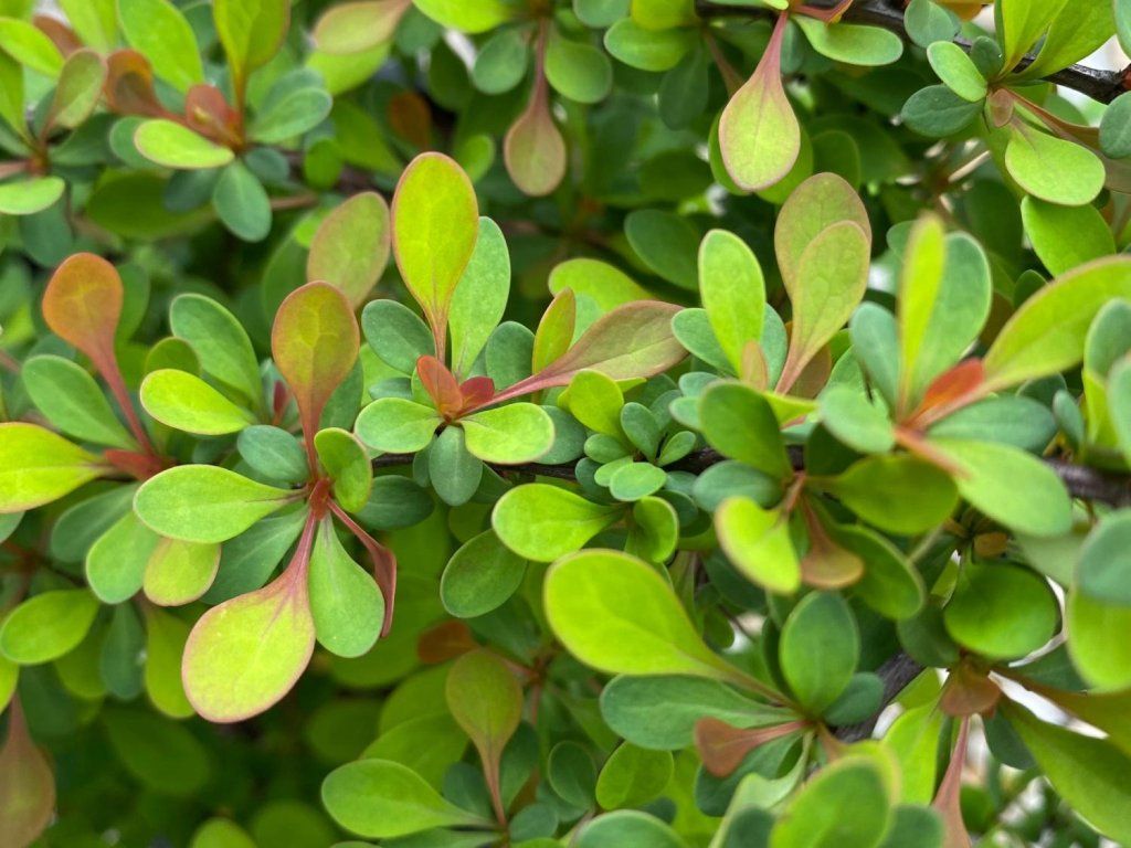 Berberitze Thunbergs 'Green Ornament' - ein sommergrüner und sehr dicht verzweigter Berberitzen-Kultivar, der ein frisches grünes Element und eine feste Struktur in die Gartengestaltung bringt. Seine Blätter sind ziemlich groß, breit eiförmig und haben eine tiefgrüne Farbe, die während der gesamten Vegetationsperiode sehr gesund und frisch wirkt. Gerade wegen seines üppigen Laubes und seiner Fähigkeit, undurchdringliche Wände zu bilden, wird dieser Kultivar oft als grundlegendes Strukturelement im Garten verwendet. Im Herbst verwandelt sich die gesamte Pflanze dramatisch, wenn sich ihre Blätter in leuchtenden Gelb-, Orange- und Hellrot-Tönen färben, was sie zu einem der farbenprächtigsten Elemente der Herbstkomposition macht. Im Mai erscheinen an den Zweigen kleine gelbe Blüten, die entlang der dornigen Triebe verstreut sind. Er ist die ideale Wahl für mittelgroße Hecken, Gruppenpflanzungen von Unterwuchssträuchern oder als Füllgrün an Stellen, an denen Widerstandsfähigkeit und minimale Pflege erforderlich sind.