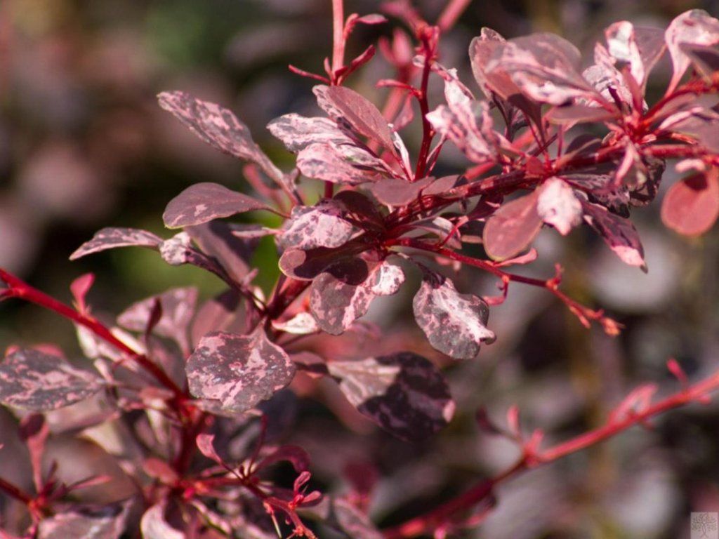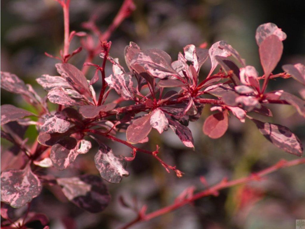 Berberitze Thunbergs 'Harlequin' – eine Zierform der Berberitze Thunbergs, einer Pflanzenart, die ursprünglich aus Ostasien stammt, insbesondere aus Japan und China, wo sie natürlich an sonnigen Hängen, Waldrändern und in Gebüschen vorkommt. 'Harlequin' entstand als eine Selektion, die auf unregelmäßige Blattfärbung und kompaktes Wachstum abzielt, wodurch sie zu einem auffälligen, aber gleichzeitig ruhig wirkenden Laubgehölz gehört. Sie erreicht eine Höhe von etwa 0,8-1 m und eine Breite von 1-1,2 m, mit einem dichten, halbkugelförmigen Habitus und leicht überhängenden Ästen mit kleinen Dornen. Die Blätter sind klein, elliptisch, der grundlegende purpurne Farbton ist unregelmäßig mit rosa, hellroten bis cremeweißen Flecken gesprenkelt, wobei die Intensität der Sprenkelung von Trieb zu Trieb leicht variieren kann. Im Mai blüht sie mit kleinen, gelben Blüten, die einzeln oder in kleinen Büscheln wachsen und unauffällig, aber wichtig für die Unterstützung bestäubender Insekten sind. Im Herbst erscheinen glänzend rote Beeren, die lange dekorativ sind, insbesondere nach dem Laubfall. Die Früchte sind nicht zum Verzehr bestimmt. Die Früchte sind nicht zum Verzehr bestimmt. Die Sorte wird als farblicher Akzent in Strauchgruppen, in niedrigen Hecken, in Vorgärten und in Kübeln eingesetzt, wo sie mit dunkelgrünen Nadelgehölzen, Ziergräsern oder immergrünen Sträuchern kontrastiert.