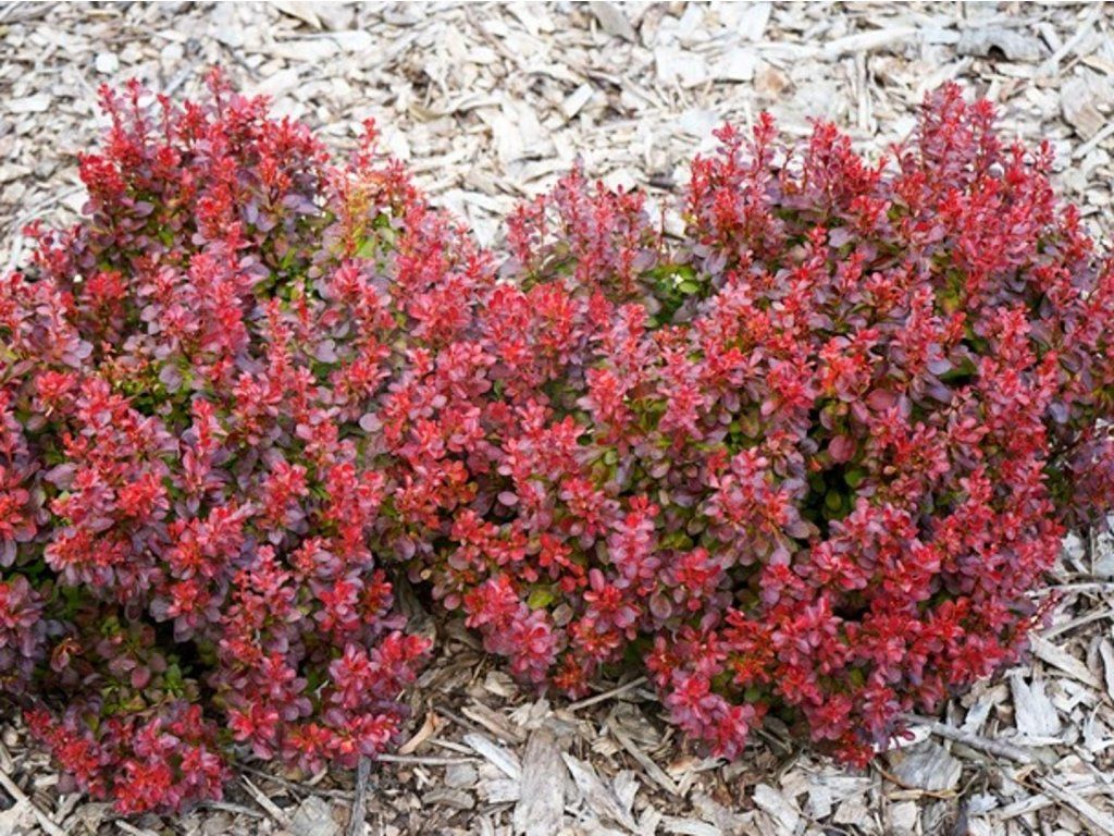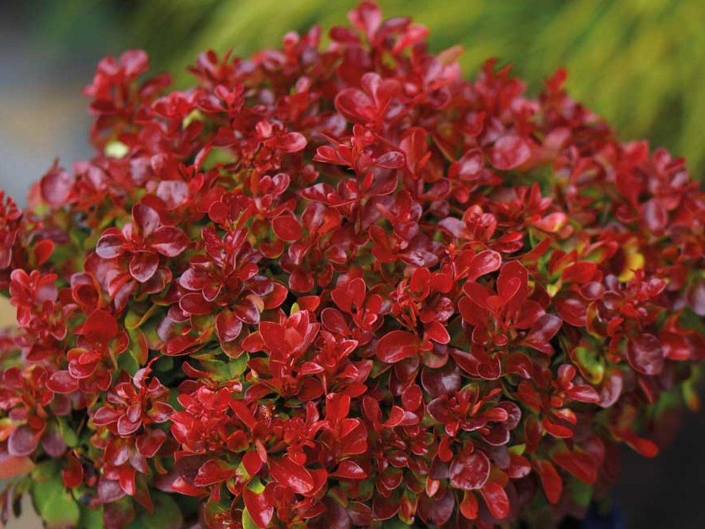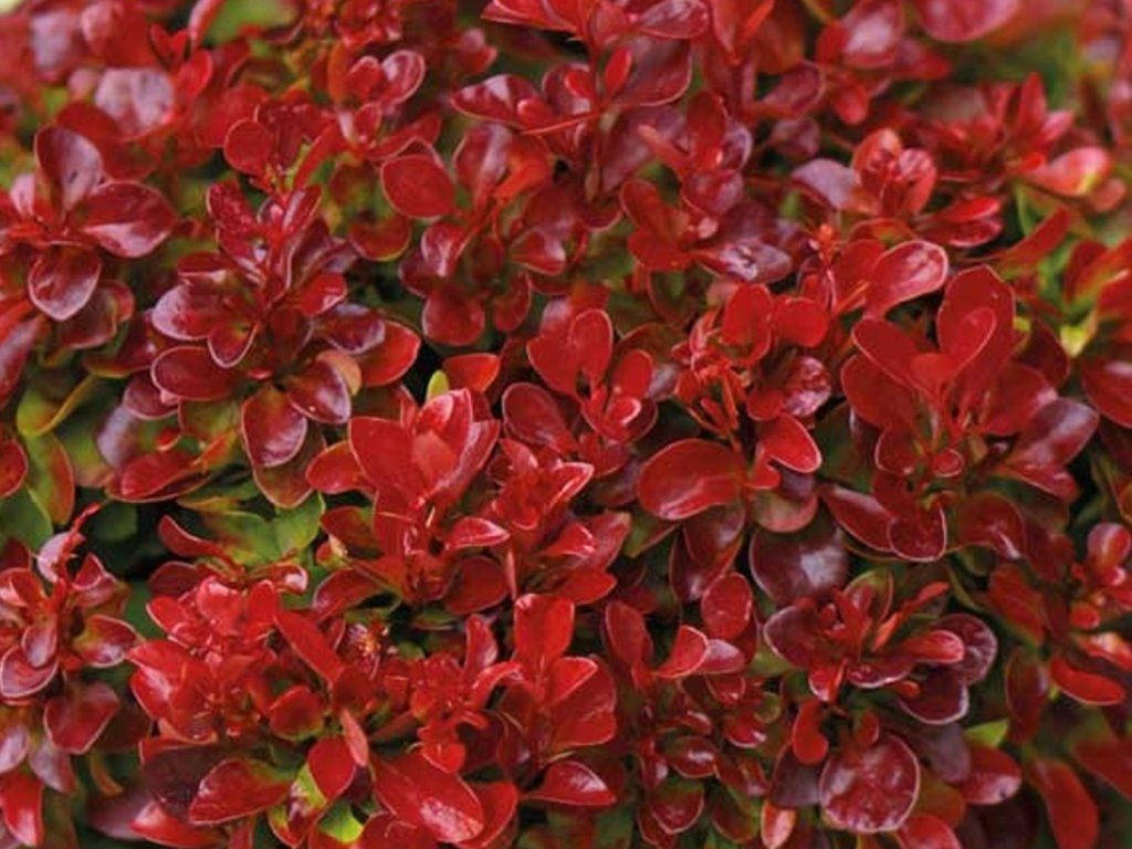Berberitze Thunbergs 'Lutin Rouge' - ein kompakter Zierkultivar der Berberitze Thunbergs, einer Pflanzenart aus Ostasien, insbesondere Japan, wo sie natürlicherweise auf offenen, sonnigen Hängen, Waldrändern und in Gebüschen vorkommt. 'Lutin Rouge' wurde mit Schwerpunkt auf niedriges Wachstum, regelmäßigen Habitus und lang anhaltende stabile dunkelrote Blattfärbung gezüchtet, wodurch sie auch in kleineren Gärten und formelleren Pflanzungen gut zur Geltung kommt. Der Strauch erreicht eine Höhe von ca. 0,5-0,7 m und eine Breite von 0,8-1 m, wächst langsam und bildet eine dichte, halbkugelförmige Form mit leicht überhängenden, dornigen Trieben. Die Blätter sind klein, elliptisch, während der gesamten Vegetationsperiode tief weinrot bis dunkelviolett, mit einem feinen Glanz. Im Herbst vertieft sich die Farbe zu warmen Rottönen, die die Attraktivität des Strauches auch nach dem Laubfall der umliegenden Gehölze verlängern. Im Mai trägt sie kleine, gelbe Blüten, die einzeln oder in kleinen Büscheln wachsen, unauffällig, aber wichtig für Bienen und andere bestäubende Insekten. Im Herbst reifen glänzende rote Beeren, besonders dekorativ im Winter, die Früchte sind nicht zum Verzehr bestimmt. Die Sorte wird als niedrige Hecke, Beetumrandung, Teil von Strauchgruppen oder als kontrastierendes Element zu hellblättrigen Sträuchern, Stauden, Ziergräsern und immergrünen Gehölzen verwendet.