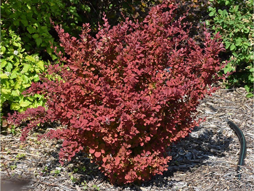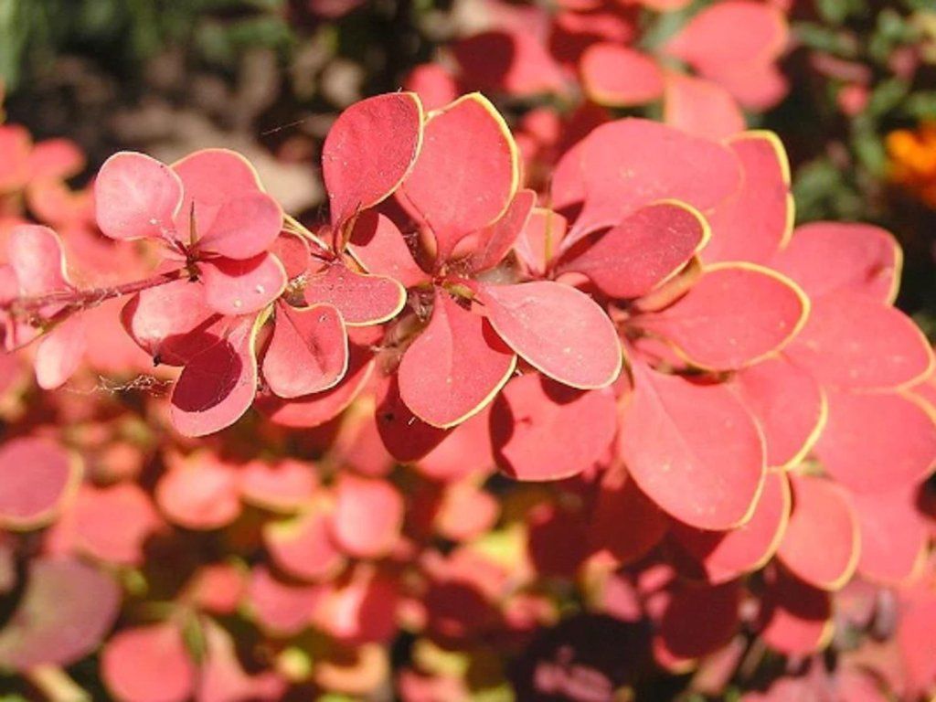 Berberitze Thunbergii Toscana ´BailJulia´ - laubabwerfender, dorniger und kompakt wachsender Strauch. Die Wuchshöhe im Erwachsenenalter beträgt etwa 100-150 cm. Die Blätter sind größer, weinrot gefärbt mit goldener Umrandung. Mit Beginn des Herbstes färben sie sich dunkelrot. Ideal als Solitärstrauch oder in Gruppenpflanzungen mit anderen Kultivaren. Wird auch häufig als Hecke verwendet.