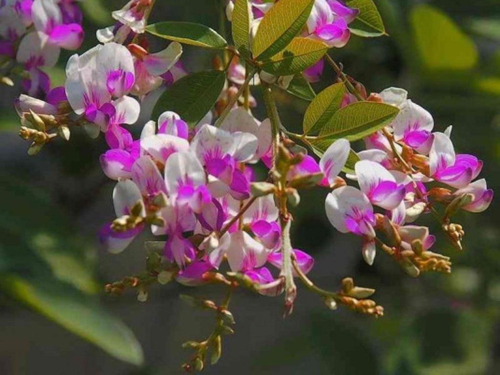 Thunbergs Buschklee 'Edo-Shibori' - die Sorte 'Edo-shibori' wird in europäischen Katalogen für zweifarbige Blüten aufgeführt, die an eine feine Marmorierung in Weiß- und Rosatönen erinnern. Der Strauch bildet einen brunnenartigen, überhängenden Habitus mit bogenförmigen, in der Saison schnell wachsenden Trieben und dreifach gefiederten Blättern in frischem Grün. Im ausgewachsenen Zustand bewegt sie sich meist um 1,5–2 m in der Höhe und 2–3 m in der Breite, an geschützten Standorten wirkt sie wie ein breites Gewölbe über dem Beet. Von August bis Oktober bilden sich an den Triebspitzen Trauben kleiner, schmetterlingsblütiger Blüten, im warmen Herbst kann die Blüte bis in den November hinein andauern. Die Blüten liefern Pollen für Herbstinsekten und fügen sich in der Komposition gut in Ziergräser, Fetthennen, Astern und trockene Hortensienblütenstände ein, wo die rosa Tupfen die späte Jahreszeit aufhellen. Als Hülsenfrüchtler bildet sie an den Wurzeln Knöllchen mit Bakterien, die Luftstickstoff binden, weshalb sie sich auch für Beete mit geringerem Düngebedarf eignet. Die zarte Blattzeichnung wirkt neben großblättrigen Stauden, wie Funkien oder Christophskräutern, leicht, und überhängende Zweige kommen auch am Rand von Hochbeeten zur Geltung, von wo sie frei herabfallen können.