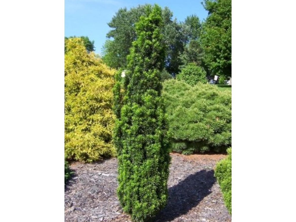 Zwischen-Eibe 'Flushing' - ein schmalwüchsiger Eibenkultivar, der eine Höhe von 1,5 - 3 m und eine Breite von etwa 0,6 - 1 m erreicht. Die Verzweigung erstreckt sich nach oben. Die Nadeln sind dunkelgrün, glänzend und das ganze Jahr über attraktiv. Sie fallen nicht ab. Dieser Kultivar ist weiblich, so dass sich rote Beeren bilden, die einen schönen Kontrast zu den grünen Nadeln bilden. Sie eignet sich als Solitärpflanze für Steingärten, Kübel oder Gruppenpflanzungen. Es handelt sich um eine giftige Pflanze.
