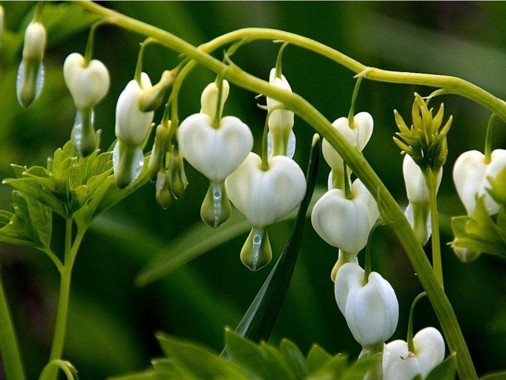 Tränendes Herz 'Alba' - syn. Lamprocapnos spectabilis. Dies ist ein weiß blühender Kultivar der beliebten Unterwuchs-Staude aus Ostasien. Der Horst erreicht eine Höhe von ca. 50–70 cm und eine Breite von 45–60 cm, wodurch er sich für den Unterwuchs, für Hostas und für Behälter in einer kühleren Ecke eignet. Die Pflanze treibt früh im Frühling aus und bildet einen luftigen, leicht überhängenden Horst mit fein geteilten, grünen bis blaugrünen Blättern. Im Mai und Juni erheben sich über dem Laub bogenförmige Stängel, auf denen herzförmige Blüten von ca. 2–3 cm Länge, reinweiß und deutlich plastisch, angeordnet sind. Die weiße Farbe ist auch aus der Ferne im Halbschatten gut sichtbar, sodass die Kultivarpflanze sich gut als heller Punkt zwischen dunkelblättrigen Funkien, Purpurglöckchen oder Farnen, oder in romantischen Pflanzungen an einer Bank eignet. Nach der Blüte zieht sich die Pflanze oft allmählich zurück und macht Platz für später austreibende Stauden. Wie andere Arten des Tränenden Herzens enthält sie Isochinolin-Alkaloide, weshalb sie beim Verzehr als leicht giftig gilt und empfindliche Haut reizen kann.