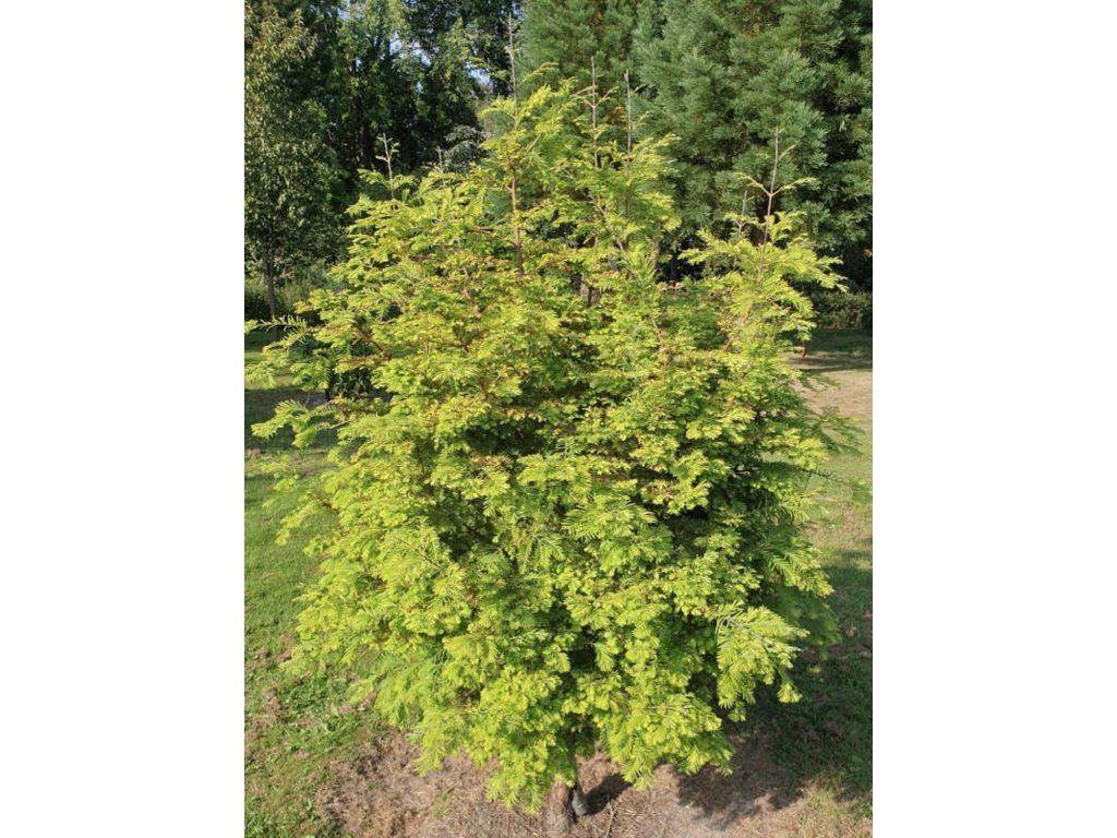 Chinesische Metasequoia 'Chubby' - eine langsam wachsende Sorte der Chinesischen Metasequoia mit dichtem, kegelförmigem Wuchs. Die Nadeln sind weich, hellgrün, färben sich im Herbst in wunderschöne bronzefarben-orangene Töne und fallen ab. Sie erreicht eine Höhe von etwa 2–3 Metern, was sie auch für kleinere Gärten zur idealen Wahl macht. Sie verträgt leichte Staunässe und ist vollständig frostbeständig. Sie eignet sich hervorragend als Solitärpflanze oder für Gruppenpflanzungen.