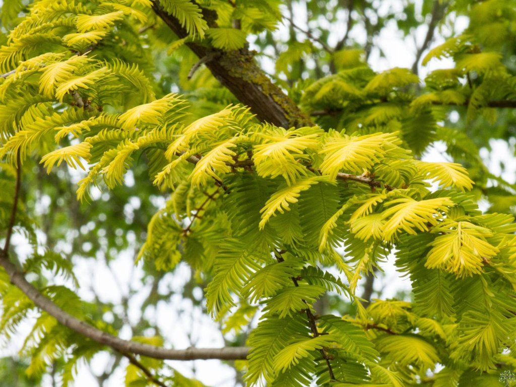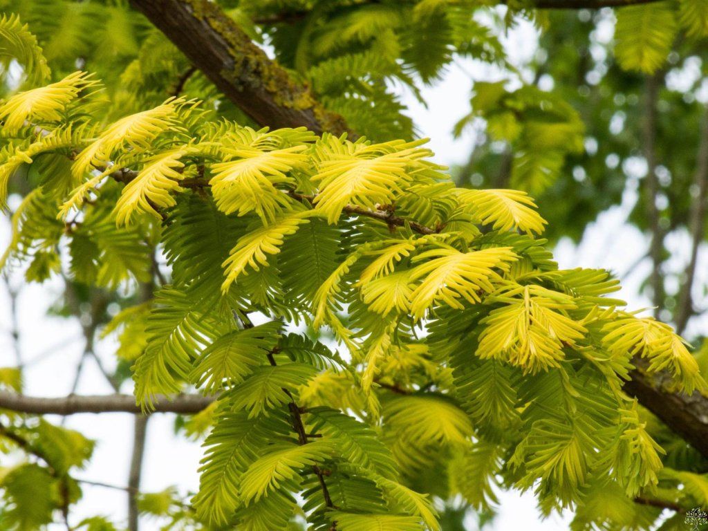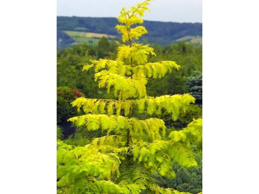 Chinesische Metasequoia 'Goldrush' - ein sommergrüner Nadelbaum aus den feuchten Tälern und Berghängen Zentralchinas, der in Gärten für sein schnelles Wachstum und die feine, „farnartige“ Struktur seiner Zweige geschätzt wird. Die Rinde ist zimtfarben bis rötlichbraun, schält sich mit der Zeit in Streifen ab und betont die winterliche Silhouette. Der Kultivar 'Goldrush' (in einigen Katalogen auch unter dem Handelsnamen Gold Rush oder als Selektion 'Golden Oji', patentiert 1994, geführt) wurde wegen seines ausgeprägt gelben Austriebs im Frühjahr und seines schlankeren, regelmäßig pyramidenförmigen Habitus ausgewählt. Im ausgewachsenen Zustand erreicht er normalerweise eine Höhe von etwa 10–15 m und eine Breite von 4–6 m, wodurch er luftiger wirkt als die typische Art. Die weichen, flachen Nadeln sind an kurzen Trieben in gegenständigen Reihen angeordnet. Im Sommer beruhigt sich die Farbe zu einem Gelbgrün, im Herbst nimmt sie kupferbraune Töne an und fällt dann ab. Im Mai erscheinen unauffällige männliche Staubkätzchen und an älteren Pflanzen kleine, kugelförmige Zapfen, die im Herbst reifen. Die kleinen Zapfen sind normalerweise 2–2,5 cm groß. Dank einer tieferen Durchwurzelung ist der Baum auch bei Wind stabil. In der Komposition kommt er als Solitär, am Teich oder als heller Akzent zu dunkelgrünen Eiben, Tannen und Ziergräsern zur Geltung.
