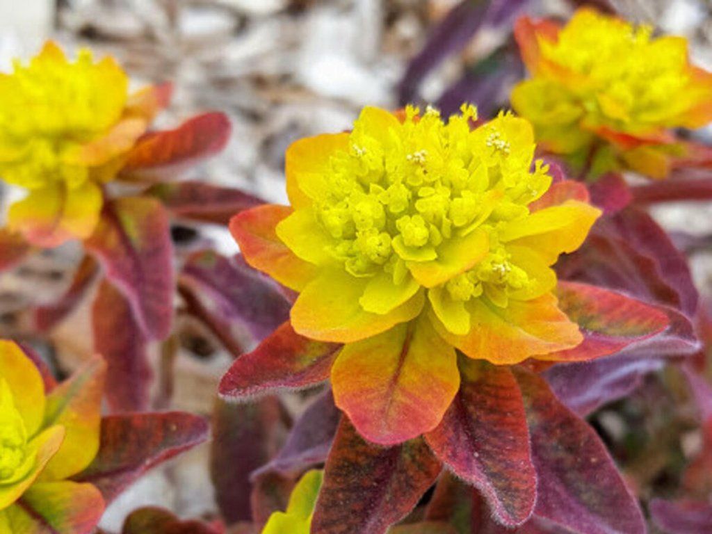 Wolfsmilch 'Bonfire' - eine ausdauernde und anmutige Pflanze, die für ihre schöne Blüte geschätzt wird. Gehört zur Familie der Wolfsmilchgewächse. Sie hat eine dichte Bodenrosette aus Blättern und aufrechte Stängel, die aus dieser Rosette wachsen. Sie erreicht normalerweise eine Höhe von etwa 30-40 cm. Die Blätter sind wechselständig angeordnet, elliptisch geformt und haben eine weinrote Farbe. Im Frühling und Sommer blüht sie mit goldgelben Blüten in rot-orangen Tönen, die einen Kontrast zu den Blättern bilden und den Eindruck von Feuer erwecken. Die Blütezeit ist von Mai bis Juni. Die Blüten sind klein und blühen an den Spitzen der Stängel. Die Blütenstände sind attraktiv für Bienen und andere Bestäuber. Sie wird oft als Zierpflanze für Beete und Steingärten gepflanzt. Sie kann zur Schaffung von Farbkontrasten und zur Hervorhebung von Frühlingsbeeten verwendet werden. Sie macht sich auch gut in Gruppen und Massenpflanzungen. Euphorbia ist eine schöne und anspruchslose Pflanze, die Abwechslung und Freude in den Garten bringen kann. Ihre dekorativen Blätter und Blüten werden von Gärtnern auf der ganzen Welt geschätzt.