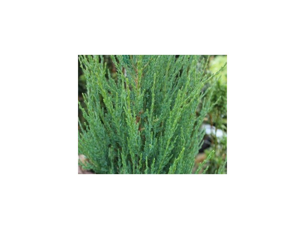 Wacholder 'Blue Arrow' - eine Kultivarpflanze des Virginischen Wacholders, die sich durch ihre schmale, säulenförmige Wuchsform und ihr ausgeprägtes blaugrünes bis stahlblaues Nadelwerk auszeichnet. Dieser Nadelbaum erreicht eine Höhe von 5 bis 8 Metern und eine Breite von etwa 1 bis 1,5 Metern, was ihn zur idealen Wahl für enge Gartenbereiche oder als vertikalen Sichtschutz macht. Die Nadeln sind schuppenförmig, dicht und bilden durch ihre Farbe das ganze Jahr über einen attraktiven Kontrast im Garten. Das Wachstum ist mittelschnell, wobei die Pflanze ihre schlanke und kompakte Form beibehält, ohne dass häufiges Beschneiden erforderlich ist. Dank seiner Anspruchslosigkeit ist er für verschiedene klimatische Bedingungen geeignet und wird häufig in städtischen und natürlichen Gärten verwendet. Diese Sorte ist ideal für diejenigen, die einen eleganten, vertikal wachsenden Wacholder mit ausgeprägter blauer Farbe suchen.