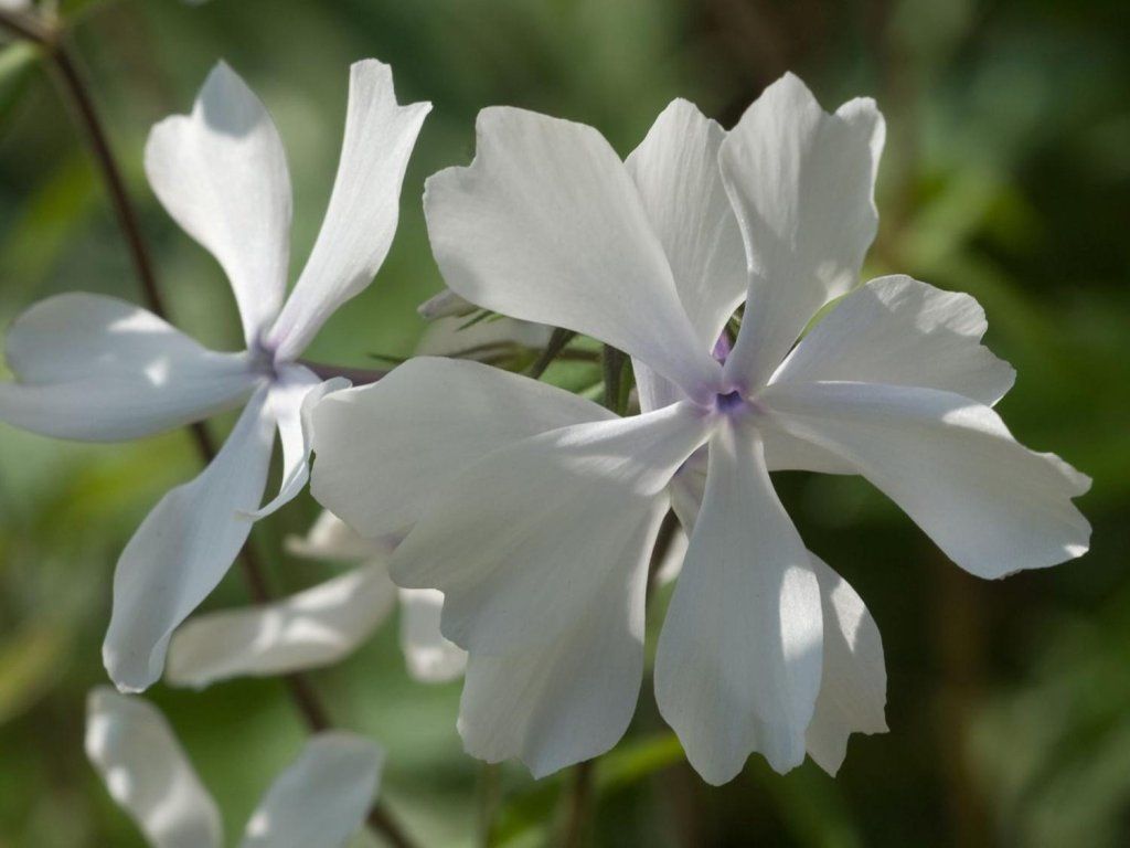 Phlox divaricata 'White perfume' – eine weniger bekannte, zwergwüchsige Phlox-Sorte, die bis zu 30 cm hoch wird. Sie bildet niedrige, kompakte Büschel, die im Mai und Juni reichlich mit luftigen, reinweißen Blüten mit einem ausgeprägten violetten Zentrum blühen. Sie duftet intensiv. Die Blätter sind frischgrün, oval und an den Spitzen spitz zulaufend. Sie eignet sich für jede Staudenpflanzung und ist aufgrund ihres niedrigeren Wuchses hervorragend als Unterpflanzung für höhere Ziersträucher oder Bäume geeignet.