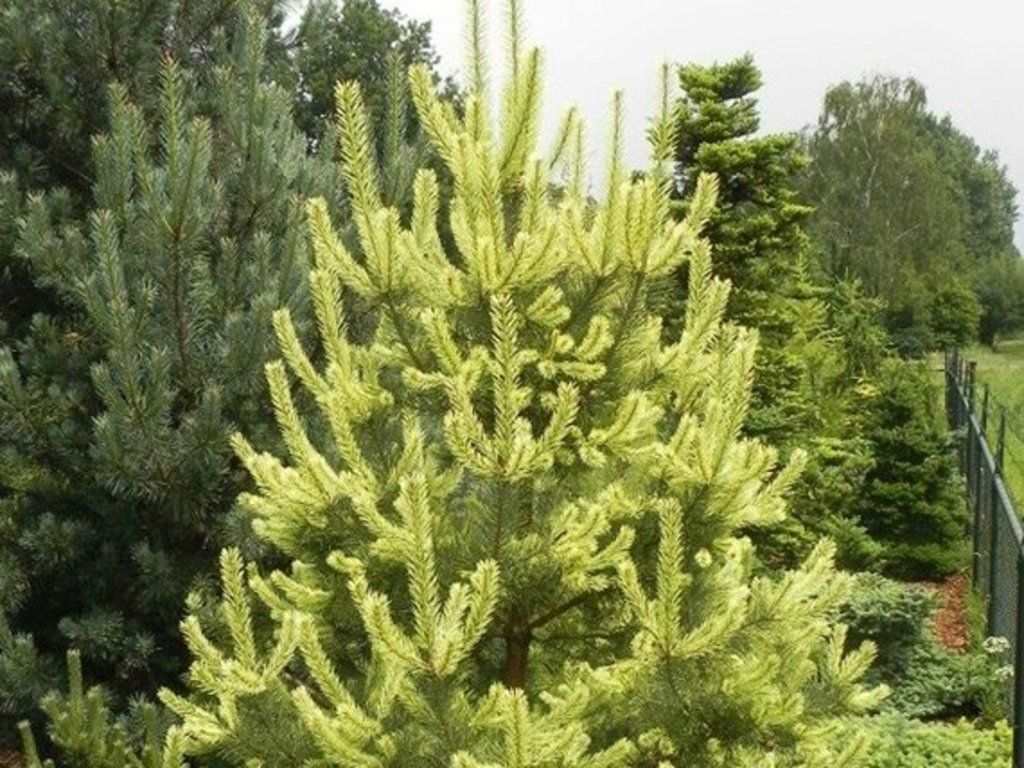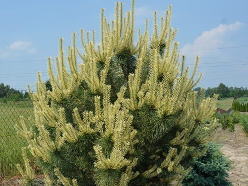 Waldkiefer 'Candlelight' - eine Art mit aussergewöhnlich weiter natürlicher Verbreitung in Eurasien, die in Gärten wegen ihrer Widerstandsfähigkeit und der Fähigkeit, auch auf ärmeren, sandigen Böden zu wachsen, geschätzt wird. Die Sorte 'Candlelight' wurde wegen der auffälligen Frühlingsfärbung der neuen Triebe ausgewählt. Von März bis Mai erscheinen an den Zweigspitzen helle „Kerzen“ und junge Nadeln von cremeweisser bis zartgelber Farbe, die im Laufe des Sommers allmählich grün werden und einen Kontrast zu den reiferen, tiefgrünen Nadeln bilden. Die helle Färbung hängt mit dem geringeren Chlorophyllgehalt in jungen Geweben zusammen, daher hält die Färbung am besten bei voller Sonne. Das Wachstum ist langsamer und kompakter, die Krone wirkt gepflegt. Im Erwachsenenalter bewegt sie sich normalerweise um eine Höhe von 3–4 m und eine Breite von 1–1,5 m, nach 10 Jahren etwa 1,5–2 m. Das Gehölz eignet sich als Solitär, in modernen Kiesgärten sowie in Kombination mit Heidekraut, Blaubeeren, Ziergräsern oder dunkleren Nadelbäumen, wo der helle Frühlingston zur Geltung kommt. Bei einer Reihe angepflanzt entsteht eine luftige Wand aus Grün, die Abstände werden oft um 1–1,2 m gewählt. Wenn Sie eine anspruchslose Nadelbaumart suchen, die auf den ersten Blick besticht, dann ist der Kultivar 'Candlelight' die beste Wahl.