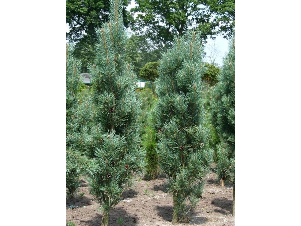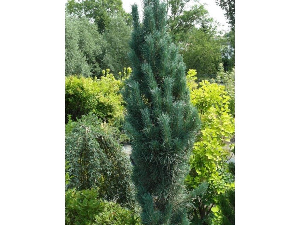 Waldkiefer 'Fastigiata' - auch bekannt als säulenförmige Kiefer. Ein Baum mit einer schmalen, säulenförmigen Krone, die der Landschaft eine ausgeprägte vertikale Struktur verleiht. Dieser Waldkiefern-Kultivar ist besonders für Gärtner geeignet, die Bäume mit vertikalem Wuchs suchen, was ideal für kleine Gärten oder enge Räume ist. Mit einem durchschnittlichen jährlichen Zuwachs von etwa 20-30 cm Höhe ist dies ein langsam wachsender Baum, der eine Höhe von etwa 10 m und eine Breite von etwa 1-2 m erreicht. Die Nadeln sind blaugrün, mit einer durchschnittlichen Länge von etwa 5 cm, und bilden einen Kontrast im Garten durch dunklere Winterknospen. Pinus sylvestris 'Fastigiata' ist wind- und frostbeständig, was sie zu einer geeigneten Wahl für verschiedene klimatische Bedingungen macht. Diese Kiefer mit ihrer hervorragenden säulenförmigen Struktur bringt nicht nur Schönheit in den Garten oder Park, sondern auch praktische Anwendung als vertikales Element für die architektonische Gestaltung von Grünflächen oder als Rahmen für Gartendesign.