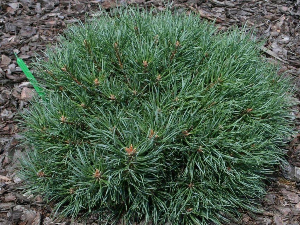 Waldkiefer 'Frensham' <\/strong>- gehört zu den Zwergkultivaren der Waldkiefer. Während der Grundkultivar mehrere zehn Meter erreicht, bildet 'Frensham' viel kleinere, kompakte Sträucher bis zu niedrigen Bäumen, die auch für kleinere Gärten geeignet sind. Das Wachstum ist anfangs sehr dicht, polsterförmig bis kugelförmig, mit gedrängten Ästen. Mit zehn Jahren sind die Pflanzen etwa 0,6–0,8 m hoch und ähnlich breit, im höheren Alter normalerweise um 1–1,2 m, nur ausnahmsweise mehr. Die Krone bleibt lange niedrig, leicht kuppelförmig, mit gleichmäßig verteilten Ästen. Die Nadeln sind kurz, etwa 3–5 cm lang, zu zweit im Büschel, steif und zahlreich, umhüllen die Triebe eng und verleihen der Pflanze ein feines, aber volles Aussehen. Die Färbung ist ganzjährig blaugrün bis leicht gräulich, im Winter kann sie etwas intensiver wirken. Beim Zerreiben der Nadeln entströmt ein typischer harziger Duft. Die Rinde älterer Pflanzen im oberen Stammbereich nimmt wärmere rotbraune Töne an, die im Winter interessant mit dem kühlen Nadelton kontrastieren. Dank seiner hervorragenden Formstabilität eignet sich 'Frensham' hervorragend für Steingärten, Heidegärten, den Rand von Nadelgehölzgruppen und kleinere Staudenbeete, wo er als permanentes Strukturelement fungiert. Er eignet sich auch für Kübel auf Terrassen und an Eingängen, wo er ganzjährige Struktur bietet und sich leicht mit Heidekraut, Funkien oder Ziergräsern kombinieren lässt.