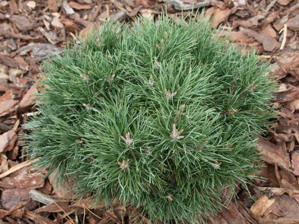 Forstkiefer 'Minima' - stammt aus einem ausgedehnten Gebiet Europas und Nordasiens, wo sie von trockenen Sandböden bis zu Berghängen wächst. Die Sorte 'Minima' überträgt die Widerstandsfähigkeit der Art in Miniatur. Sie bildet eine dichte, kugelförmige bis kissenförmige Wuchsform mit verkürzten Ästen und kurzen Nadeln, die zu zweit wachsen und eine grüne Farbe mit silbrigem Schimmer haben. Im ausgewachsenen Zustand erreicht sie üblicherweise eine Höhe von etwa 0,5 m und eine Breite von 0,6 m, der Zuwachs beträgt nur wenige Zentimeter pro Jahr, sodass die Form auch ohne Schnitt stabil bleibt. Im Mai erscheinen an den Triebspitzen hellgelbe männliche Blütenzapfen und unauffällige weibliche Blüten, aus denen sich im Laufe der Saison kleine braune Zapfen entwickeln. Ein zart harziger Duft ist besonders an warmen Tagen wahrnehmbar. Dank ihres kompakten Wachstums kommt sie in Steingärten, Heidegärten, zwischen trockenheitsliebenden Stauden oder als ganzjährig grüne Solitärpflanze im Kübel zum Einsatz. In der Komposition harmoniert sie gut mit Heidekraut, Fetthennen, Thymian und Ziergräsern, wo sie den Übergang zwischen Steinen und Staudenpflanzungen abmildert.