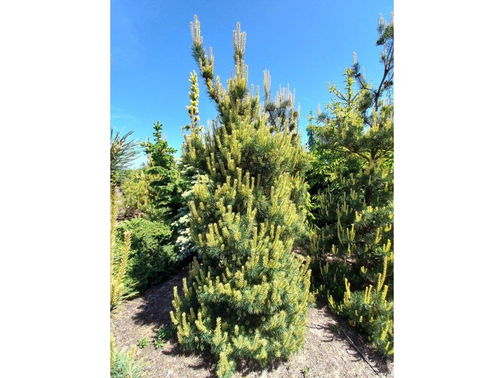 Waldkiefer 'Odegard' - gehört zu den widerstandsfähigsten europäischen zweinadeligen Kiefern und ist in der tschechischen Landschaft eine heimische Art. Die Sorte 'Odegard' wurde als auffallend gefärbte Selektion in Norwegen gefunden, wo sie von Arne Ødegård im Gebiet Isvik entdeckt wurde. Der Habitus ist schmal-kegelförmig bis pyramidal, mit einer dichteren Krone als die gewöhnliche Waldkiefer in freier Landschaft. Die Nadeln wachsen zu zweit in Büscheln, sind mittellang und fühlen sich weicher an, grün gefärbt mit einem gelben Ton. Im April und Mai tragen die jungen Triebe cremefarbene bis zitronengelbe Spitzen, die besonders in voller Sonne hervorstechen. Während des Sommers beruhigt sich die Farbe zu einem grünlich-gelben Ton, im Winter bleibt sie ein gedämpftes Grün. Das Wachstum ist langsam, nach etwa 10 Jahren kann es etwa 2 m erreichen, im Erwachsenenalter bewegt es sich normalerweise um 2 m × 1–1,2 m nach 10 Jahren. Zapfen können sich an älterem Holz bilden, sie sind dekorativ, nicht essbar. Die Sorte eignet sich als Solitärpflanze für Vorgärten, in Schotterbeeten und in Kombinationen mit Ziergräsern und immergrünen Sträuchern. Bei älteren Teilen kann sich allmählich eine fein schuppig abblätternde Rinde mit einem orangen Ton entwickeln, typisch für die Waldkiefer. Wenn Sie also einen Nadelbaum suchen, der auf den ersten Blick besticht, dann ist diese Sorte die richtige Wahl.