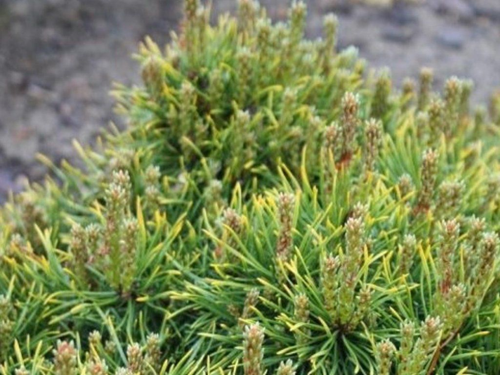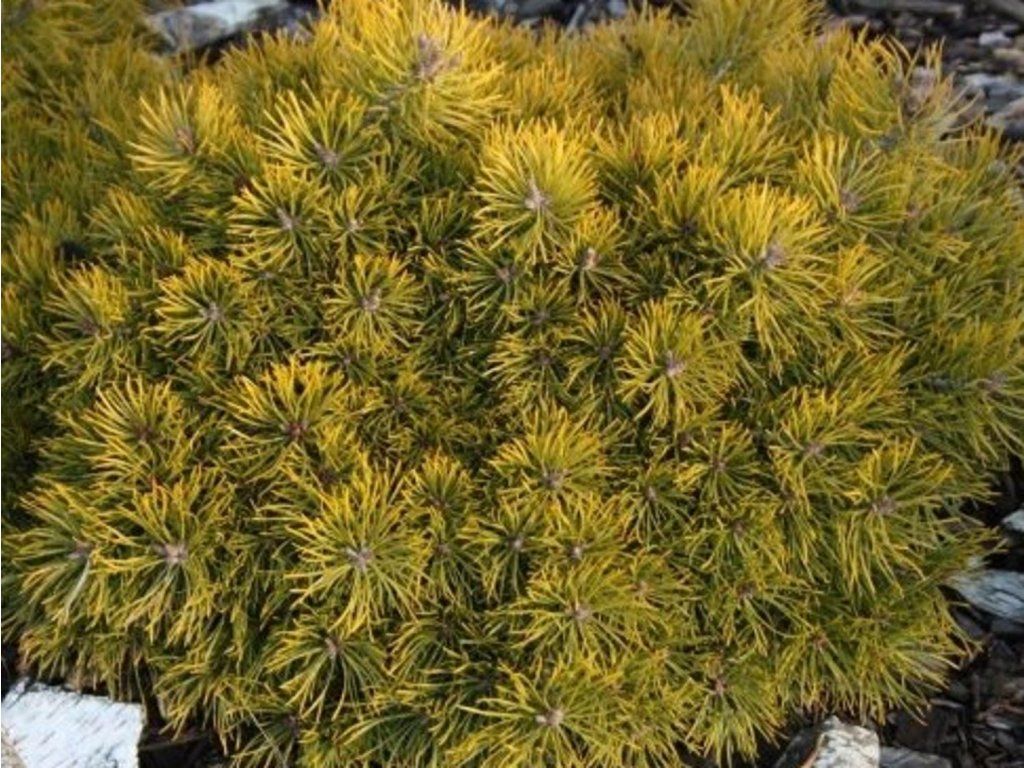 Waldkiefer 'Skjak II' - kompakter Kultivar, mit ursprünglich rundlichem, später eher kegelförmigem Wuchs. Wächst langsam auf eine Höhe von 70 cm. Ein charakteristisches Merkmal ist die gelbe Färbung der Nadeln, die im Herbst erscheint und bis ins Frühjahr anhält.
