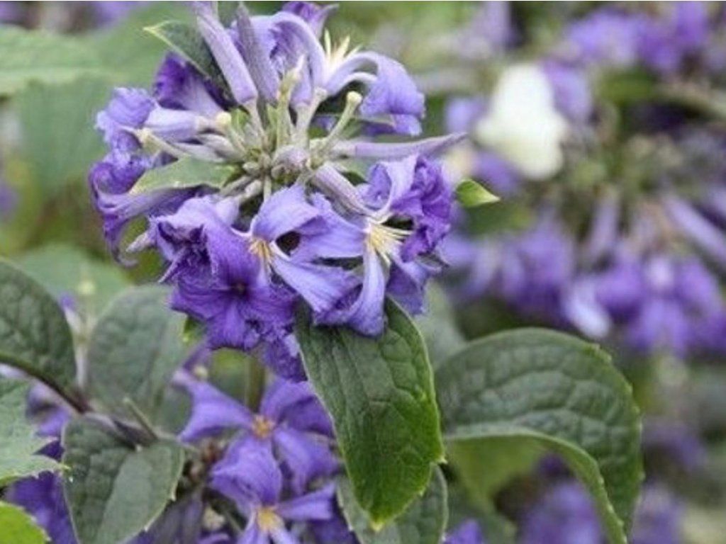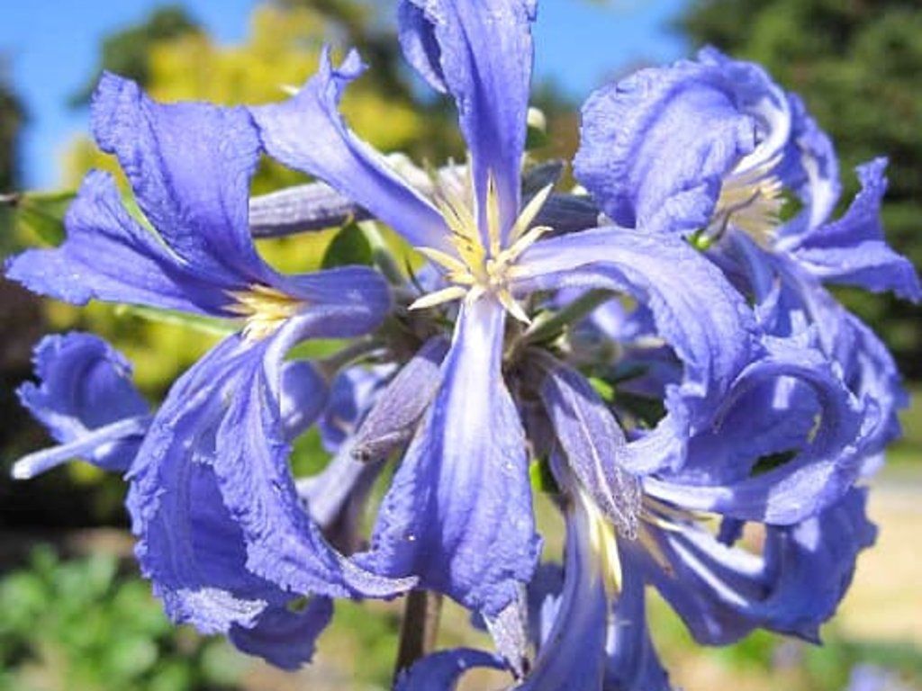 Clematis 'Cassandra' - gehört zu den nicht kletternden Clematis, bildet aufrechte, teilweise verholzende Stängel und verhält sich wie eine auffällige Staude. Diese Sorte stammt aus deutscher Züchtung in der Staudengärtnerei Gräfin von Zeppelin, wo sie wegen ihres kompakten Habitus und ihrer effektiven Sommerblüte ausgewählt wurde. Der Strauch erreicht eine Höhe von etwa 1–1,2 m und eine ähnliche Breite, bildet eine dichte, leicht halbkugelförmige Krone, die sich gut im Vordergrund von Staudenbeeten oder als Übergang zwischen höheren Gehölzen und niedrigeren Stauden eignet. Die Blätter sind gegenständig, eiförmig bis breit lanzettlich, mittelgrün, mit einem fein gezähnten Rand. Von Juli bis September bildet die Pflanze reiche endständige Rispen von blauen, eng röhrenförmigen Blüten, deren Blütenblätter sich im oberen Teil leicht öffnen und einen zarten Duft verströmen. Die Blüte ist interessant in Form und Struktur und zieht bestäubende Insekten an. Clematis 'Cassandra' eignet sich in Kombination mit Rosen, Spieren, Ziergräsern oder hellen Funkien-Sorten, wo der blaue Farbton der Blüten einen ruhigen Kontrast bildet. Aufgrund ihres krautigen Charakters und der Blüte an den Trieben des laufenden Jahres wird sie der 3. Schnittgruppe zugeordnet.