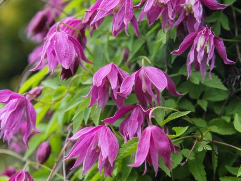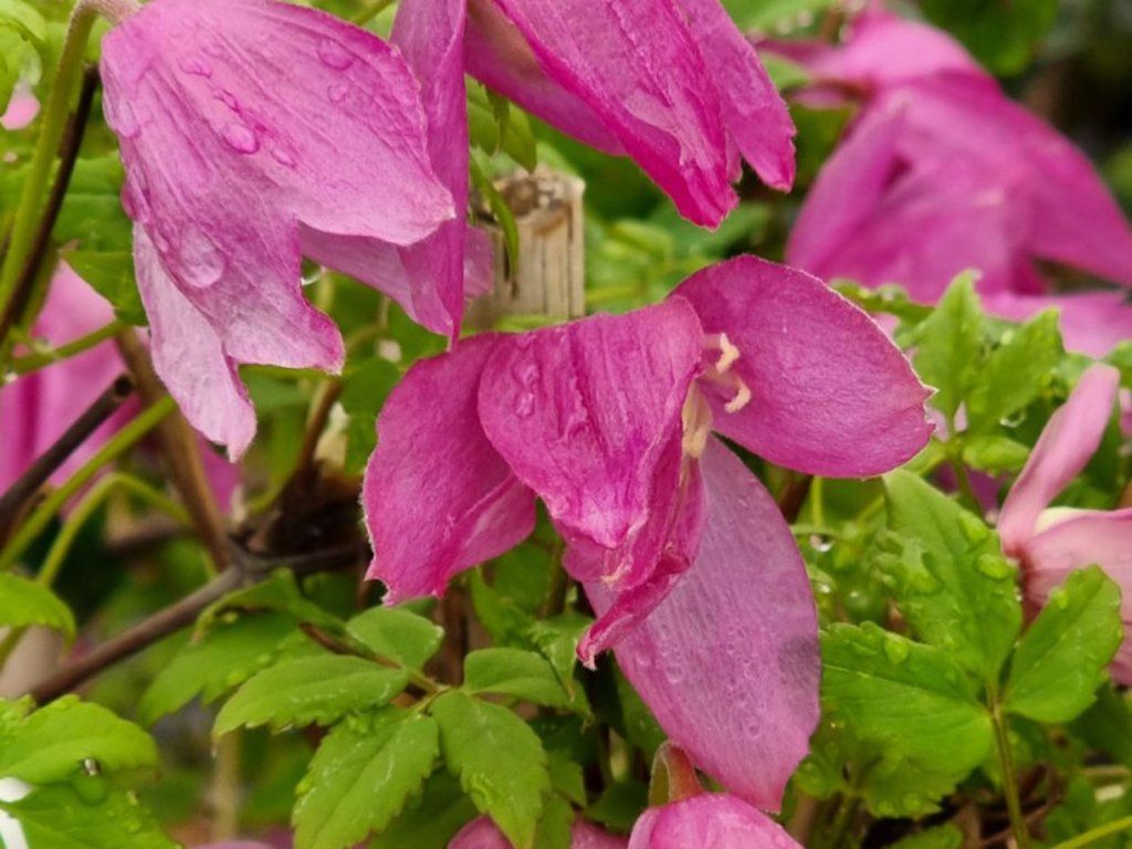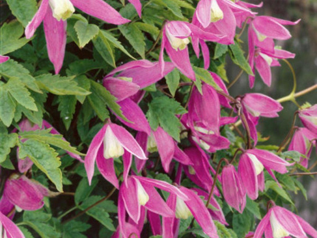 Clematis 'Constance' - eine Kultivarpflanze der Art Clematis alpina, ursprünglich aus den Bergregionen Europas, wo der natürliche Typ an lichten Waldrändern und felsigen Hängen vorkommt. Diese genetische Ausstattung spiegelt sich in seiner Kältebeständigkeit und seiner Vorliebe für luftige, kühlere Umgebungen wider. 'Constance' bildet einen zart aufgebauten, kletternden Strauch von etwa 2 m Höhe, der sich um die Äste von Sträuchern, kleineren Bäumen oder leichten Konstruktionen windet. Die Blätter sind grün, oft geteilt, mit einem leichten, fast farnartigen Ausdruck, der luftig wirkt. Von April bis Mai trägt er eine Vielzahl von hängenden, glockenförmigen Blüten mit einem Durchmesser von etwa 4–6 cm, die aus schmalen rosa Blütenblättern bestehen und halb gefüllt sein können. Im Inneren erscheinen hellere Staubblätter, die der Blüte ein zartes Zentrum verleihen. Unter guten Bedingungen kann die Pflanze schwach nachblühen und im Sommer mehrere Blüten hervorbringen. Die Blüten duften oft leicht, der Duft ist jedoch nicht ausgeprägt. Nach dem Abblühen bilden sich dekorative Samenstände mit federartigen Anhängseln, die der Pflanze auch nach dem Hauptblüteende Anmut verleihen. Dank des leichten Aufbaus der Triebe eignet sich die Sorte für natürlich gestaltete Kompositionen, alte Zäune, kleinere Nadelgehölze oder Laubsträucher, wo sie den Eindruck einer frei fließenden blühenden Quelle erzeugt. Gehört zur 1. Schnittgruppe der Clematis.
