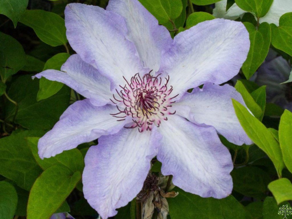 Clematis 'Ivan Olsson'- eine schwedische großblütige Clematis aus der Gruppe der früh blühenden Sorten, geschätzt für ihre zarte, helle Farbe und lange Blütezeit. In Gartenbedingungen bildet er eine laubabwerfende Kletterpflanze, die normalerweise 2–2,5 m in der Höhe und ca. 1–1,5 m in der Breite erreicht, abhängig von der Bodenqualität und der Größe der Stütze. Die Triebe haften sich mit Blattstielen an der Stütze fest, wodurch sie leicht Spaliergerüste, niedrigere Pergolen oder luftigere Sträucher überwuchern. Die Blätter sind gegenständig, mittelgrün und fallen im Herbst ab. Die Blüten mit einem Durchmesser von etwa 8–14 cm erscheinen von Mitte Mai bis Anfang Juli, und eine zweite Blüte folgt im August bis September. Die Blütenblätter sind leicht gewellt, in der Mitte fast weiß, an den Rändern zart eisblau bis violett gefärbt, die Mitte zieren purpurne Staubgefäße auf hellen Fäden. Bei voller Sonneneinstrahlung wirkt die Blüte wie ein heller Fleck, der dunklere Hintergründe von Nadelbäumen oder Ziegelmauern aufhellt. In der Komposition lässt sich die Sorte gut mit Strauch- und Kletterrosen in rosa oder weißen Tönen, mit blau blühenden Stauden oder als zarter Begleiter zu dunkelvioletten Clematis kombinieren. Aufgrund seines mittleren Wuchses und seines leichteren Charakters eignet er sich auch für kleinere Gärten und stabile Balkonkonstruktionen, wo er ein vertikales Element ohne übermäßige Verholzung schafft. Gehört zur 2. Schnittgruppe der Waldreben.