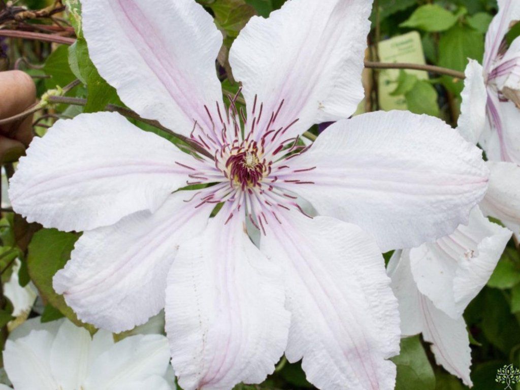 Clematis 'Jan Pawel II' - eine polnische großblumige Waldrebe aus der Gruppe der früh bis mittelfrüh blühenden Sorten, gezüchtet von Stefan Franczak Ende der 70er Jahre. Der Name erinnert an Papst Johannes Paul II., was die Pflanze nicht nur zu einem Zier-, sondern auch zu einem symbolisch wahrgenommenen Gartenelement macht. Unter unseren Bedingungen bildet sie eine laubabwerfende Kletterranke, die je nach Bodenqualität und Stützgröße etwa 3–4 m hoch und 1–1,5 m breit wird. Die Triebe sind relativ dünn, biegsam und werden von den Blattstielen an der Stütze befestigt, wodurch sie leicht Pergolen, Drahtzäune, Holzpfähle oder ältere Sträucher überwuchern. Die Blätter sind grün, gefiedert bis dreiteilig und bilden während der Saison einen dichten Mantel, der im Herbst abfällt und die Struktur freigibt. Die Blüten mit einem Durchmesser von etwa 13–15 cm erscheinen von Juni bis September, zunächst fast reinweiß, in der zweiten Sommerhälfte mit einem deutlicher sichtbaren rosa Streifen in der Mitte der Blütenblätter. Die Mitte zieren kontrastierende Staubgefäße in einem dunkleren Ton, die der Blüte Tiefe verleihen. Vor dem dunklen Hintergrund von Mauern oder Nadelbäumen wirken die Blüten wie Lichtflecken und ziehen auch aus größerer Entfernung den Blick auf sich. Durch die Kombination von Höhe und zarter Farbgebung eignet sich die Sorte für moderne und ländliche Gärten, städtische Höfe und Hauseingänge, wo sie vertikale architektonische Linien betont. In Kombination mit Rosen, Waldreben mit dunklen Blüten oder Hortensien schafft sie harmonische Farbübergänge. Die Blüten ziehen bestäubende Insekten an, insbesondere kleine Bienen und Schwebfliegen, jedoch sind alle Pflanzenteile beim Verzehr giftig. Gehört zur 2. Schnittgruppe der Clematis.