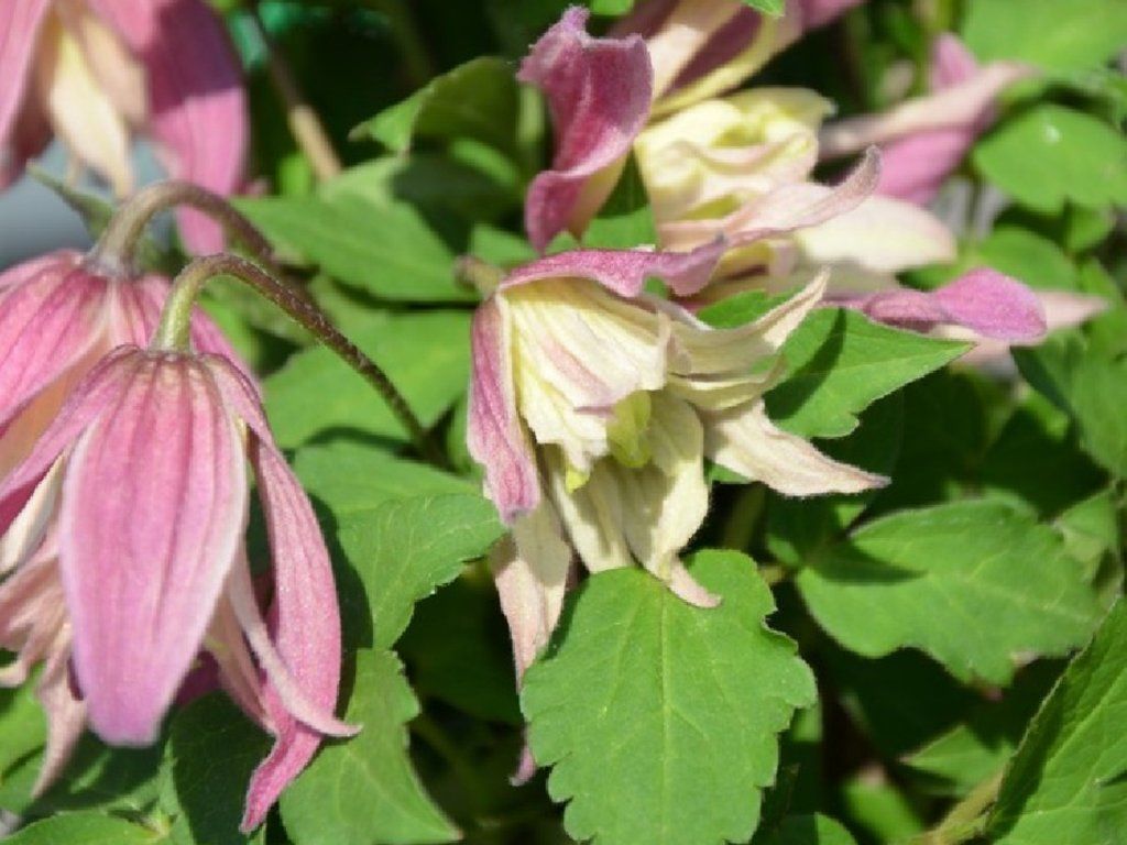 Clematis 'Janny' - eine moderne Sorte aus der Gruppe der frühjahrsblühenden Clematis, wahrscheinlich mit Anteilen der Atragene-Gruppe, die sich durch kleinere, glockenförmige Blüten und gute Kälteresistenz auszeichnet. In Gartenbedingungen bildet sie eine laubabwerfende Kletterpflanze, die etwa 2–3 m hoch und ca. 1–1,5 m breit wird. Die Triebe sind zart, gut biegsam, werden von Blattstielen an Rankhilfen befestigt und durchwachsen leicht Zäune, dünne Zweige von Sträuchern oder leichte Spaliergerüste. Die Blätter sind gefiedert, mittelgrün und bilden während der gesamten Vegetationsperiode eine luftige grüne Wolke. Die größte Zierde sind halbgefüllte, leicht überhängende, glockenförmige Blüten mit einem Durchmesser von etwa 7 cm. Die äußeren Blütenblätter sind tiefrosa, der innere Teil der Blüte ist gefüllt mit vielen hellgelblichen bis rosafarbenen schmalen Blütenblättern, die der Blüte einen leicht pfingstrosenartigen Charakter verleihen. Die Blüte erfolgt sehr früh, in der Regel Ende April und Mai, oft noch vor der vollständigen Belaubung der umliegenden Gehölze. In einem günstigen Jahr kann im Sommer eine kleinere zweite Welle einzelner Blüten auftreten, danach schmückt die Pflanze den Garten mit leicht flaumigen Fruchtständen. Farblich passt die Sorte gut zu weißen oder hellgelben Stauden, zu dunkelgrünen Nadelgehölzen oder vor dem Hintergrund von Natursteinen. Dank ihrer mittleren Wüchsigkeit eignet sie sich auch für kleinere Gärten und ältere Sträucher, die sie zur Geltung bringt, ohne sie zu überwuchern. Gehört zur 2. Schnittgruppe der Clematis.