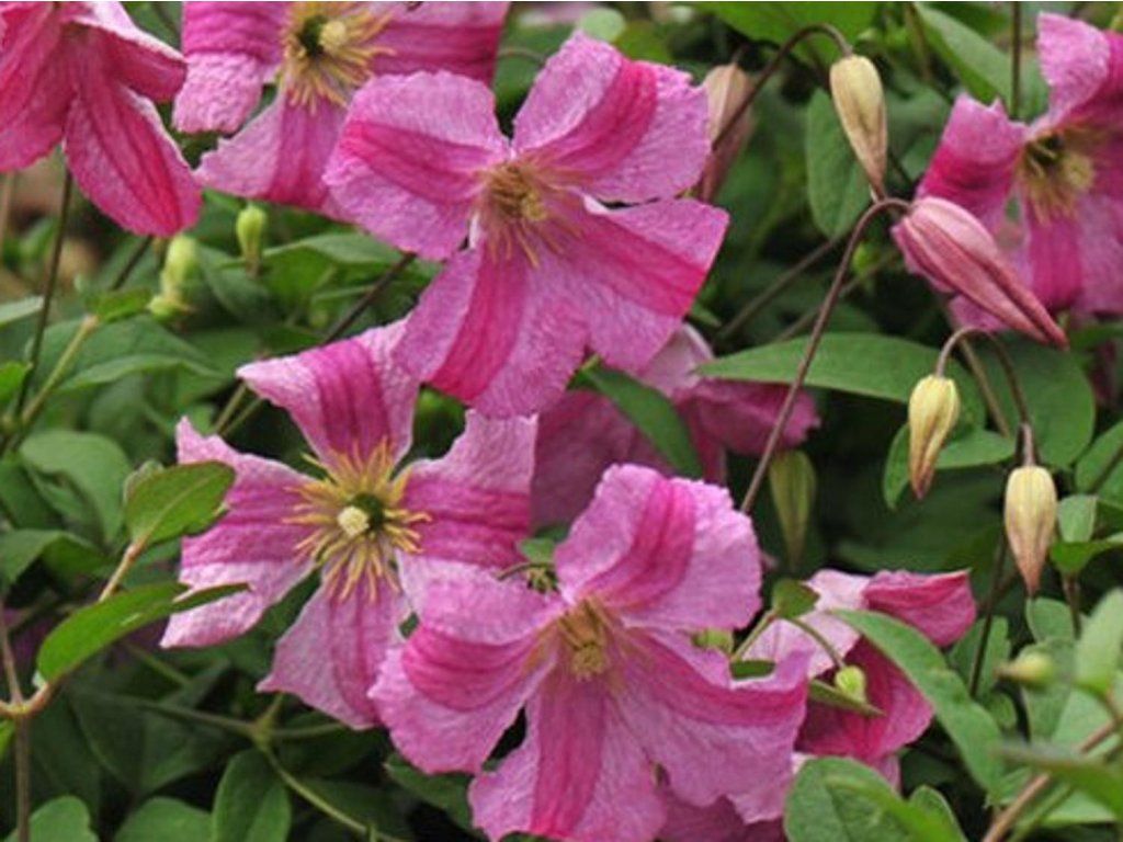 Clematis 'Krakowiak' - eine weitere sehr attraktive und interessante Clematis-Sorte, die sich vor allem durch ihre schönen Blüten auszeichnet. Die Sorte hat leuchtend rosa Blüten mit einem roten und rosa Streifen in der Mitte jedes Blütenblattes. Sie blüht reichlich von Juni bis September. Sie wird Ihren Garten während der gesamten Sommersaison mit ihren Blüten verschönern. Sie wächst schnell und erreicht normalerweise eine Höhe von ca. 2,5 - 3 m. Sie ist absolut frostbeständig. Gehört zur 3. Gruppe der Clematis, die ihren Schnitt bestimmt. Die Blätter sind größer, eiförmig und haben eine grüne Farbe. Clematis sollten auf verschiedenen Arten von Stützen angebaut werden, z. B. an Pavillons, Gittern, Stöcken, Pergolen oder anderen Stützen. Er ist pflegeleicht. Wenn Sie also eine anspruchslose und widerstandsfähige Pflanze suchen, die auf den ersten Blick beeindruckt, ist die Clematis die richtige Wahl.