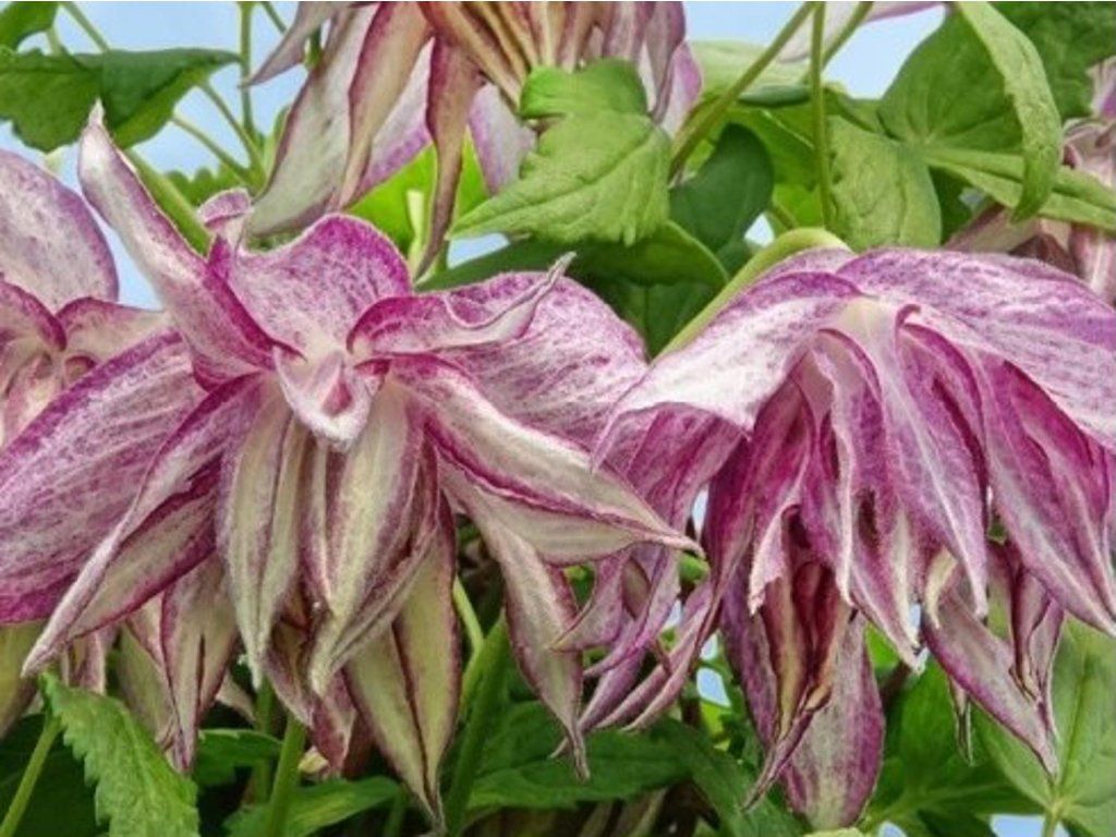 Clematis 'Pink Surprise' - gehört zur Gruppe der Atragene-Clematis, die von Arten aus kälteren Regionen abstammen und sich durch frühe Frühlingsblüte auszeichnen. Er bildet eine mittelstark wachsende, leicht rankende Kletterpflanze, die etwa 2–3 m hoch und etwa 1 m breit wird. Die Blätter sind doppelt dreizählig, fein gesägt, frischgrün, entwickeln sich im Frühjahr zusammen mit den Blüten und bilden einen leichten, luftigen Mantel. Die Blüten erscheinen hauptsächlich an den letztjährigen Trieben von April bis Mai und setzen je nach Frühlingsverlauf manchmal bis in den Juni fort. Sie haben eine glockenförmige Gestalt und sind gefüllt, die äußeren Blütenblätter sind hellrosa bis rosaviolett, die inneren kürzeren Blütenblätter sind weiß bis cremefarben, so dass die gesamte Blüte leicht zweifarbig wirkt. Der Blütendurchmesser liegt bei etwa 6–8 cm, die Blüten sind leicht hängend und kommen besonders auf erhöhten Stützen zur Geltung. Nach der Blüte bilden sich dichte Büschel von behaarten Nüsschen, die die Pflanze schmücken und ihr in der späteren Jahreszeit Struktur verleihen. ‘Pink Surprise’ eignet sich gut für Pergolen, Zäune, Holzgitter oder zwischen lockereren Sträuchern, wo sie auch in kälteren Lagen für frühe Frühlingsfarben sorgt. Gehört zur 1. Schnittgruppe der Clematis.